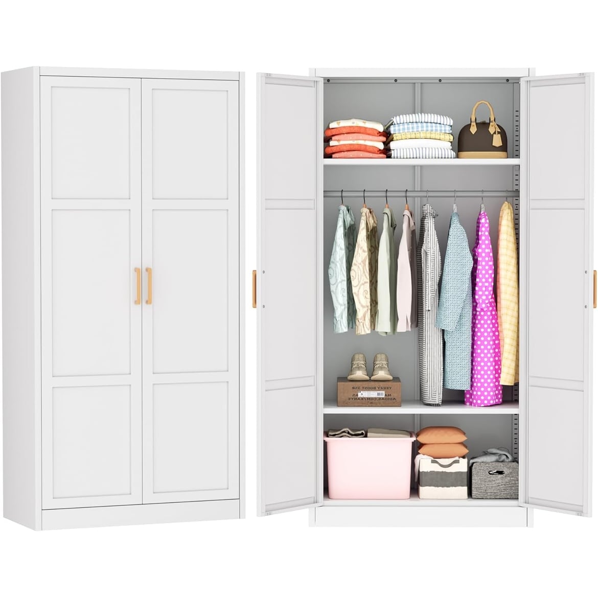72 Inch Metal Wardrobe Closet with Doors and Shelves, White, 36 Inch W x 18 Inch D, Modern Style