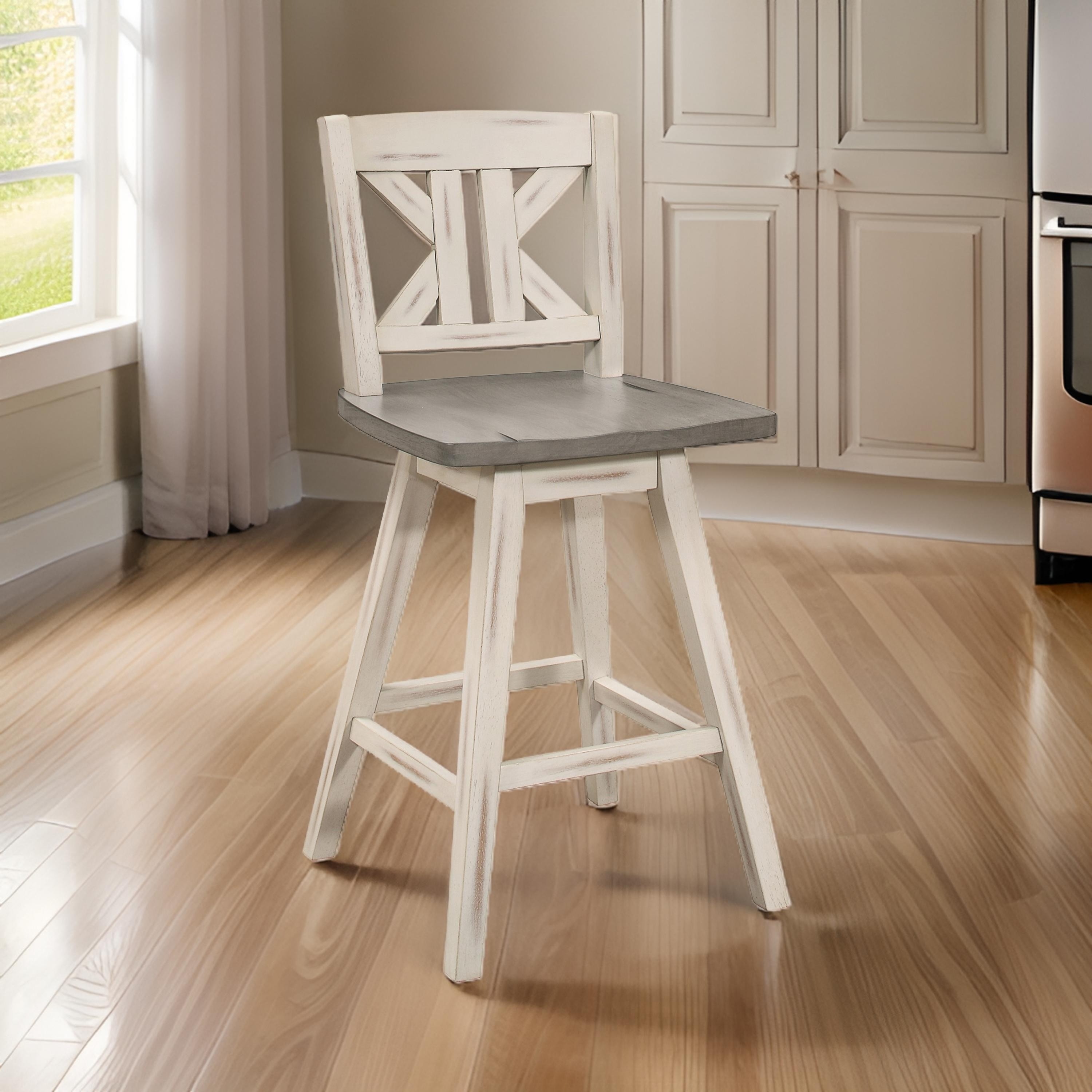 Set of 2 Swivel Bar Stools, 29 Inch Height with Divided X Back Design in Gray & White