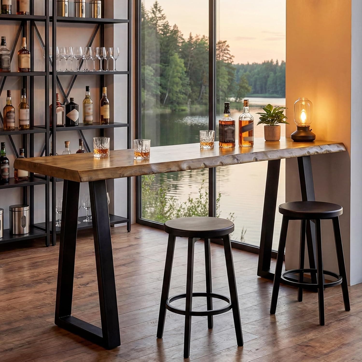 63" Solid Wood Bar Table, Long High Top Pub Table with Natural Live Edge & Metal Legs