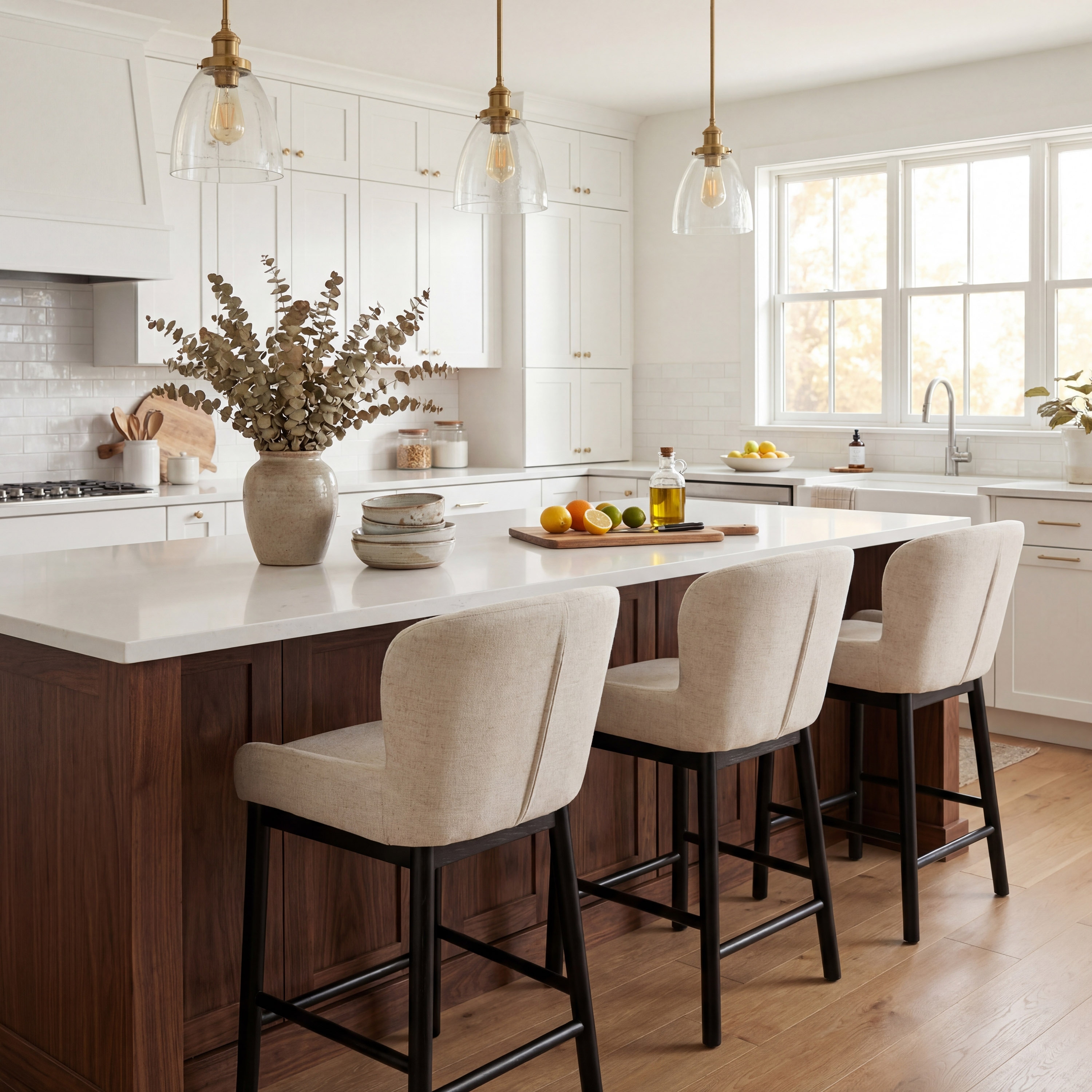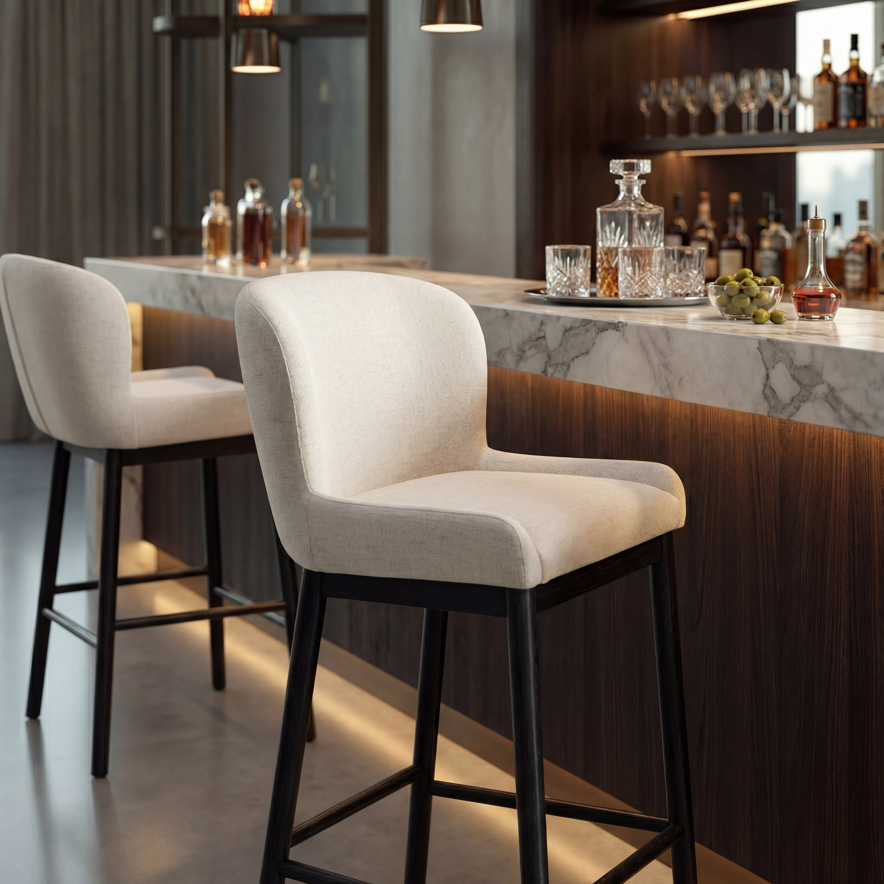 Archer Black Upholstered Bar Stool with Curved Back and Ivory Fabric Seat