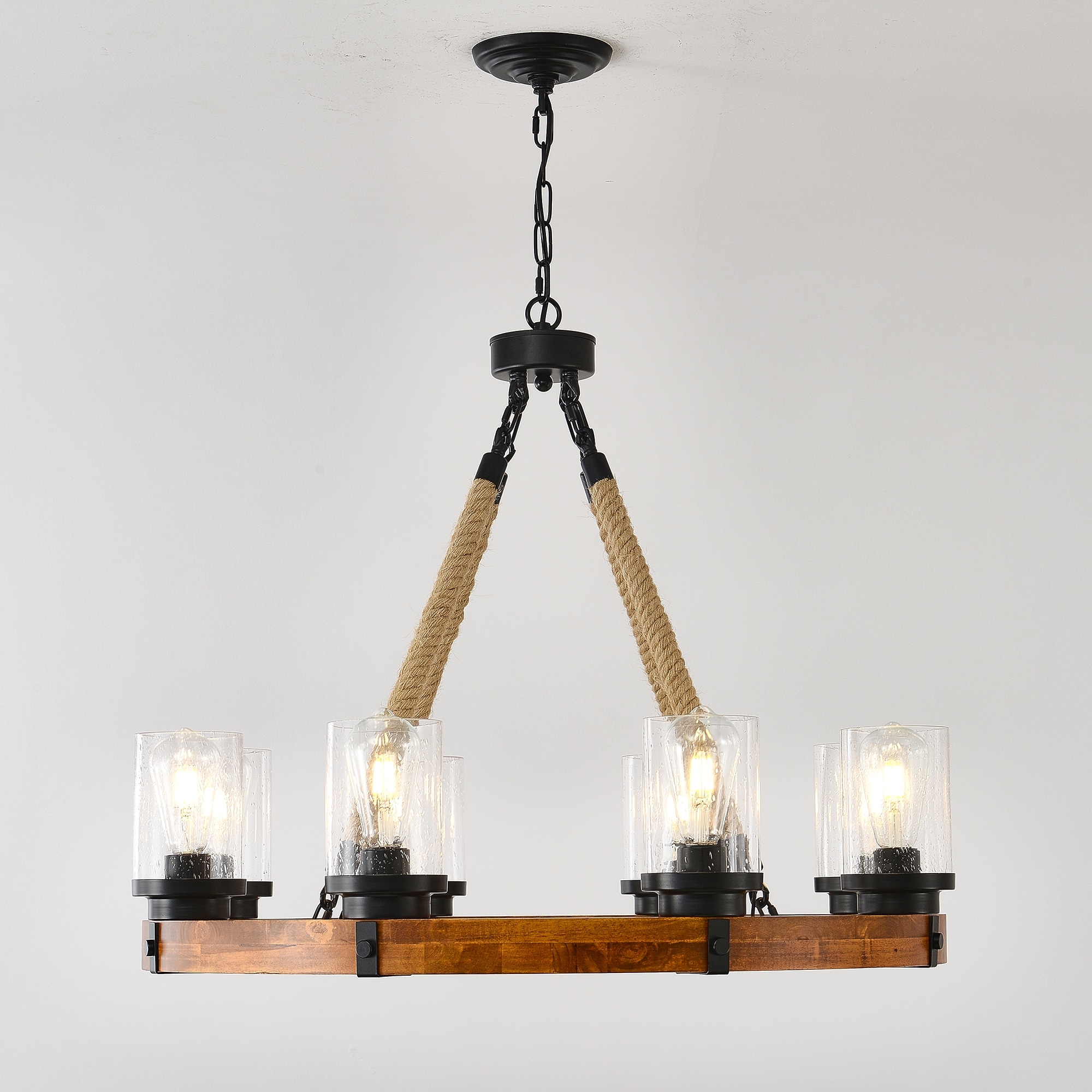 8 Light Rustic Wagon Wheel Chandelier,31"Wooden Pendant Light with Seeded Glass Shade, Industrial Chandeliers-NO INCLUDED BULBS