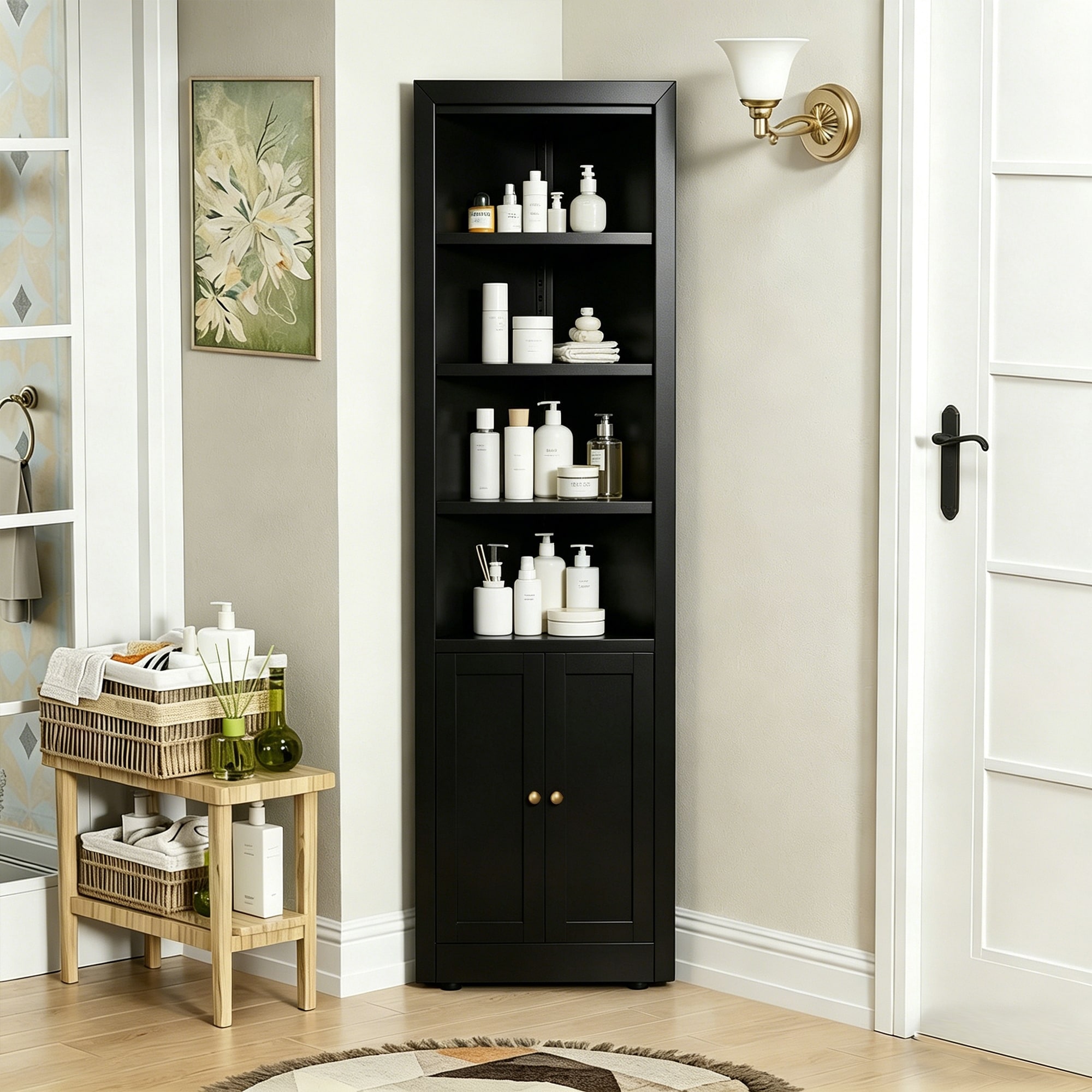68.5" Tall Bathroom Corner Cabinet with Open Shelves & Magnetic Doors Adjustable Shelving for Bathroom Storage Corner Cabinet