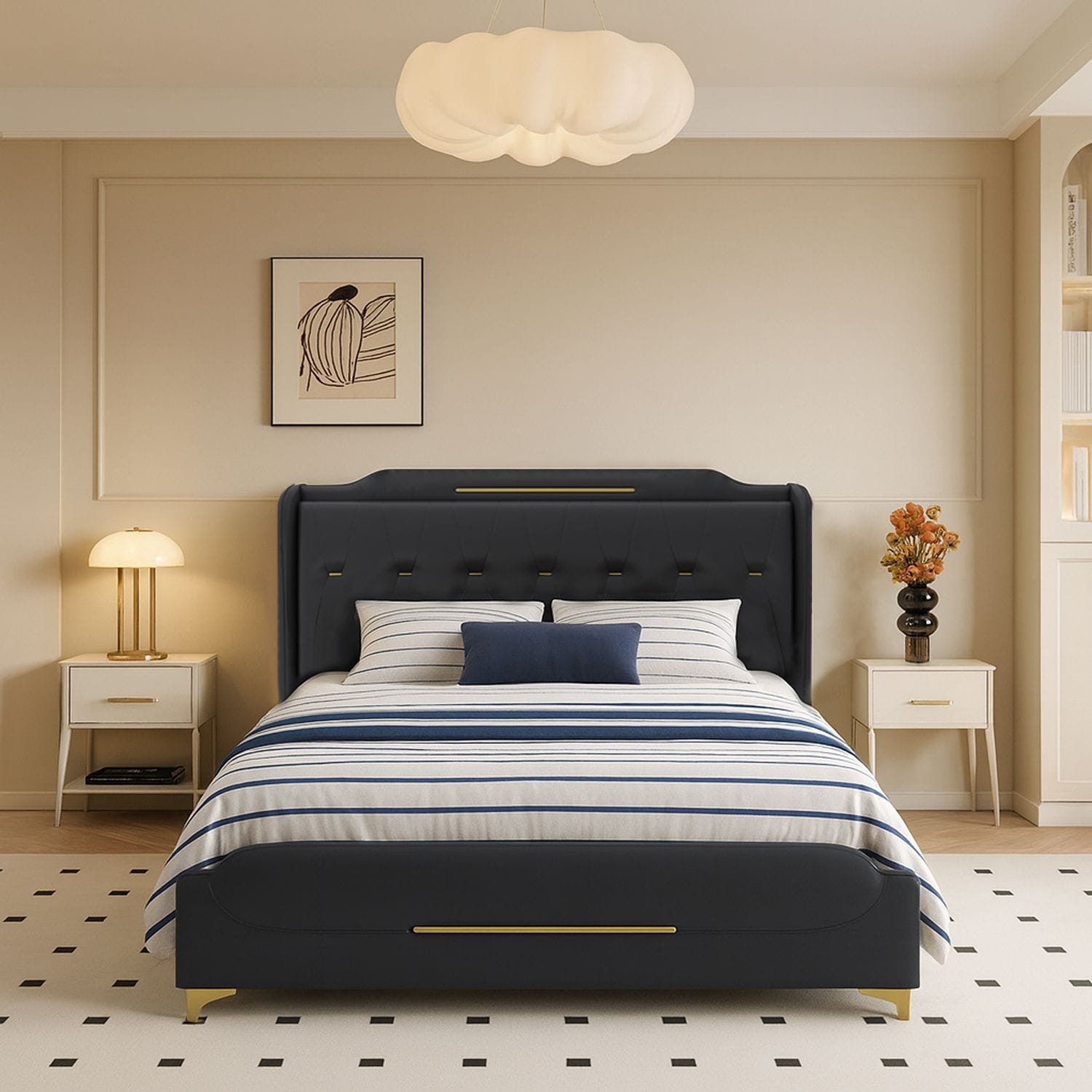 King Size Upholstered Bed Frame - Black PU Leather Platform Bed with Foam Headboard - Modern Glam Style