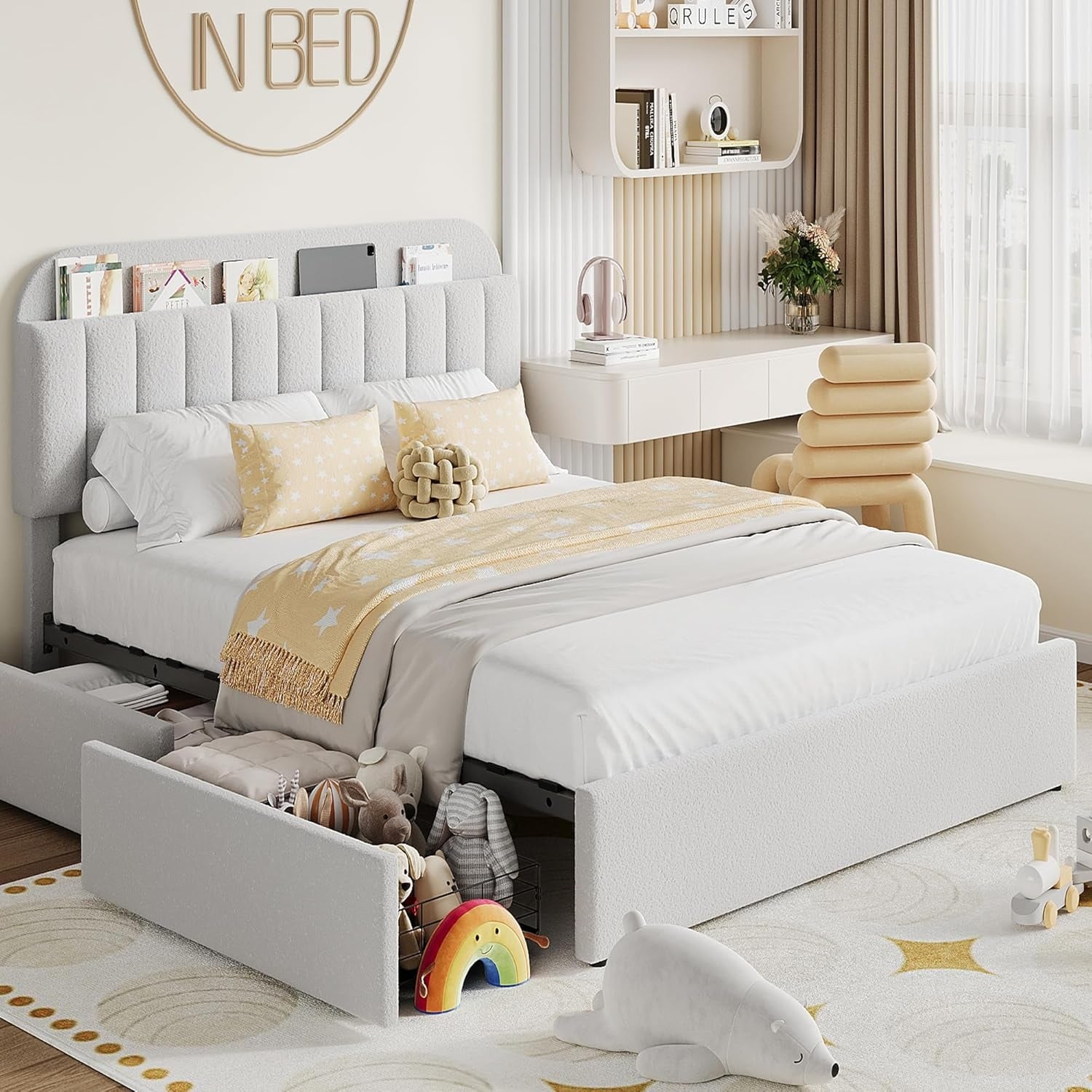 Beige Twin Bed Frame with 2 Drawers, Boucle Upholstered Platform with Bookcase Headboard, Kids/Girls Bed, Noise-Free