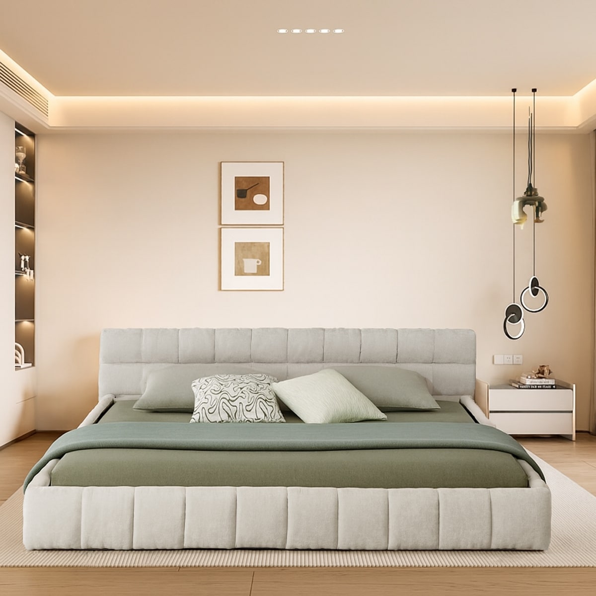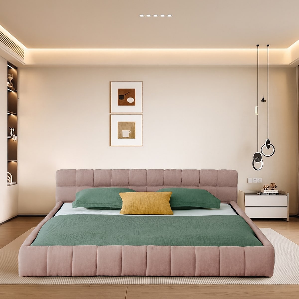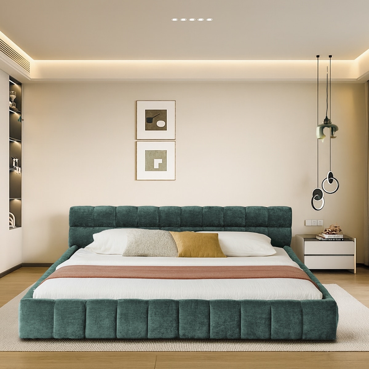 Modern Floor Standing California King Size Chenille Upholstered Platform Bed - No Box Spring Needed