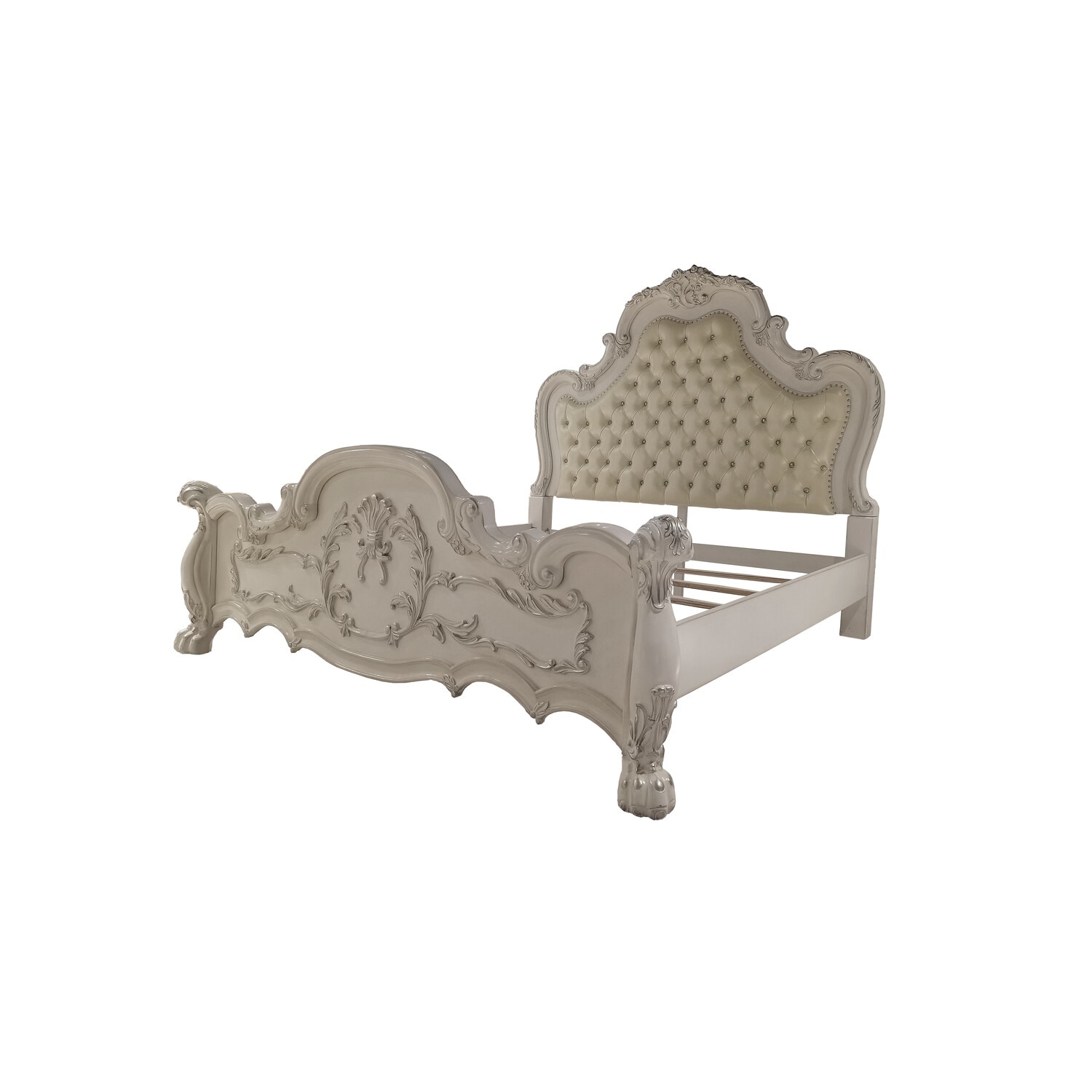California King Bed - Mediterranean Style PU Bed Frame Antique White Finish