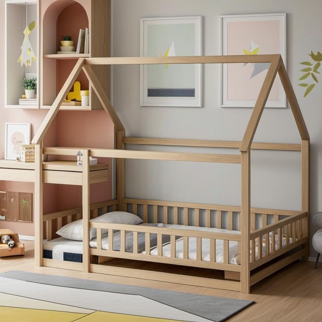 Full Size Montessori Floor Bed with Roof and Guardrails, Natural Wood Design for Kids Bedroom