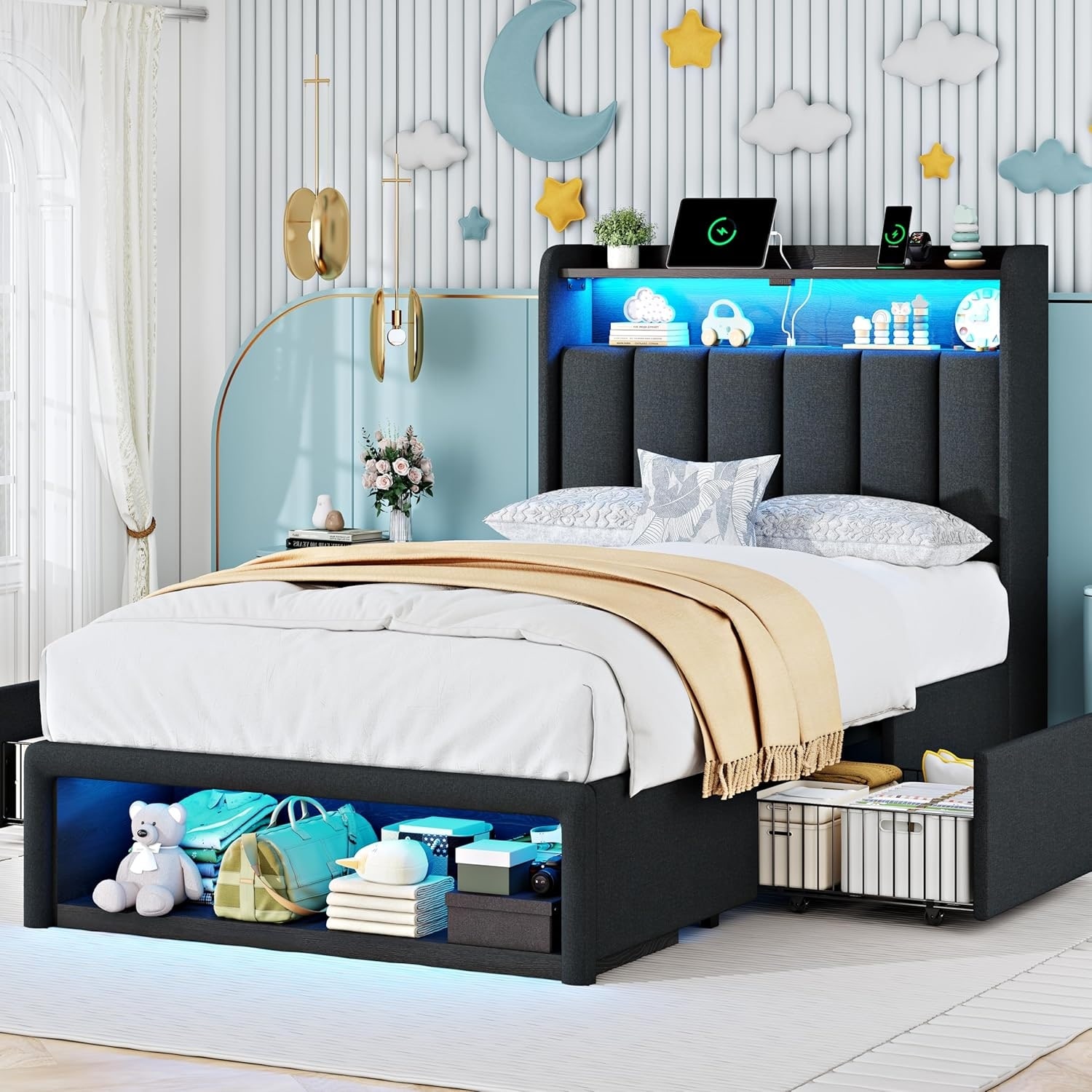 Twin Bed Frame with LED Lights, Charging Station, Storage Drawers, and Footboard Cabinet