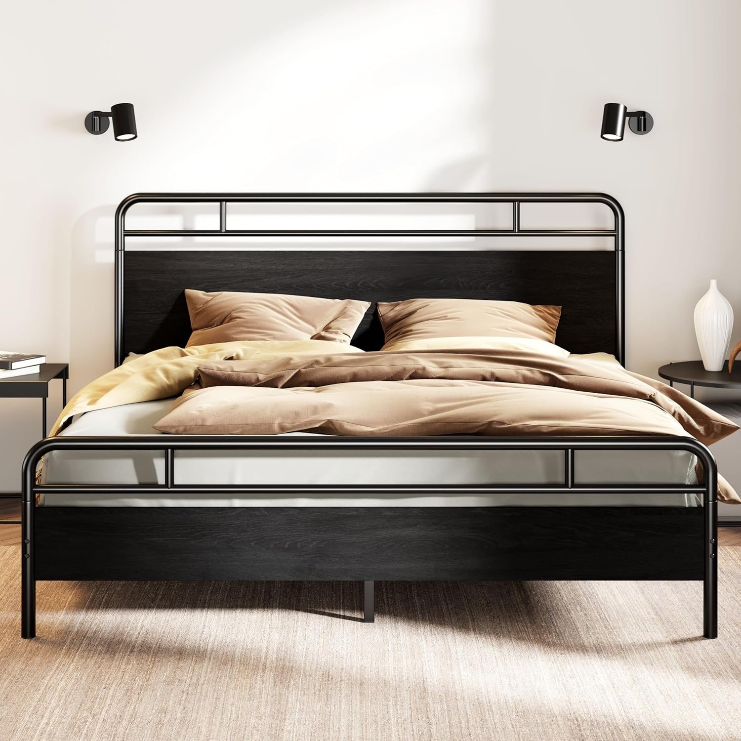 King Size Bed Frame with Vintage Wood Headboard, 12 Inch Under-Bed Storage, No Box Spring Needed, Black