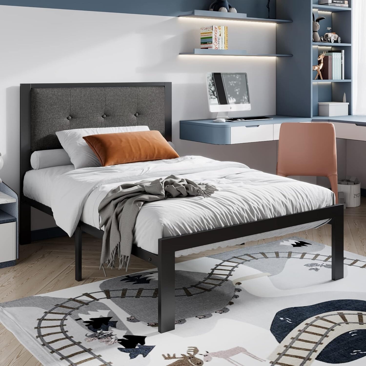 Grey Upholstered Twin Bed Frame with Button Tufted Headboard, Noise-Free, Easy Assembly, No Box Spring Needed