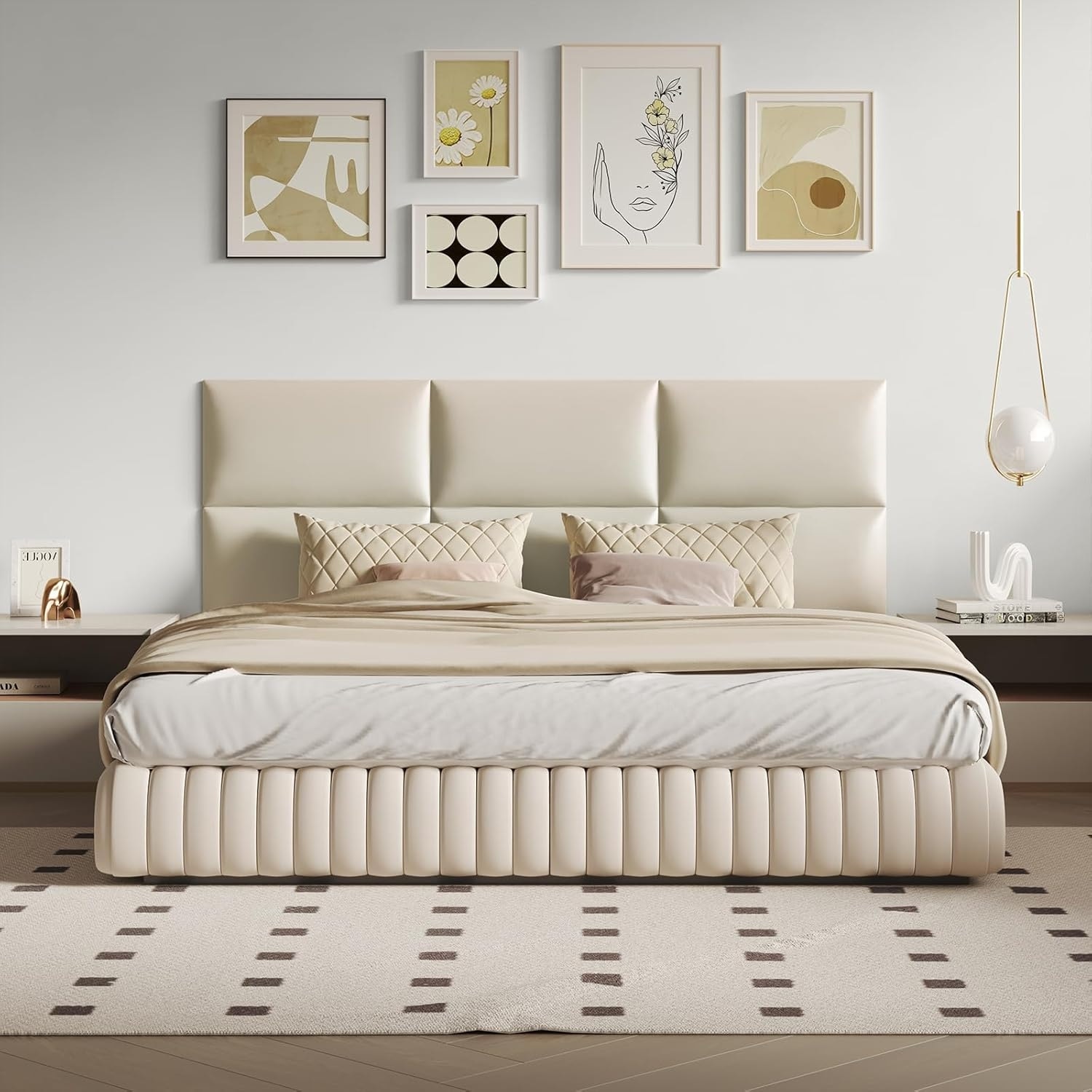 King Size Bed Frame with Upholstered Headboard, Soft Boucle Fabric, Cloud Marshmallow Design, Noise-Free, No Box Spring Needed