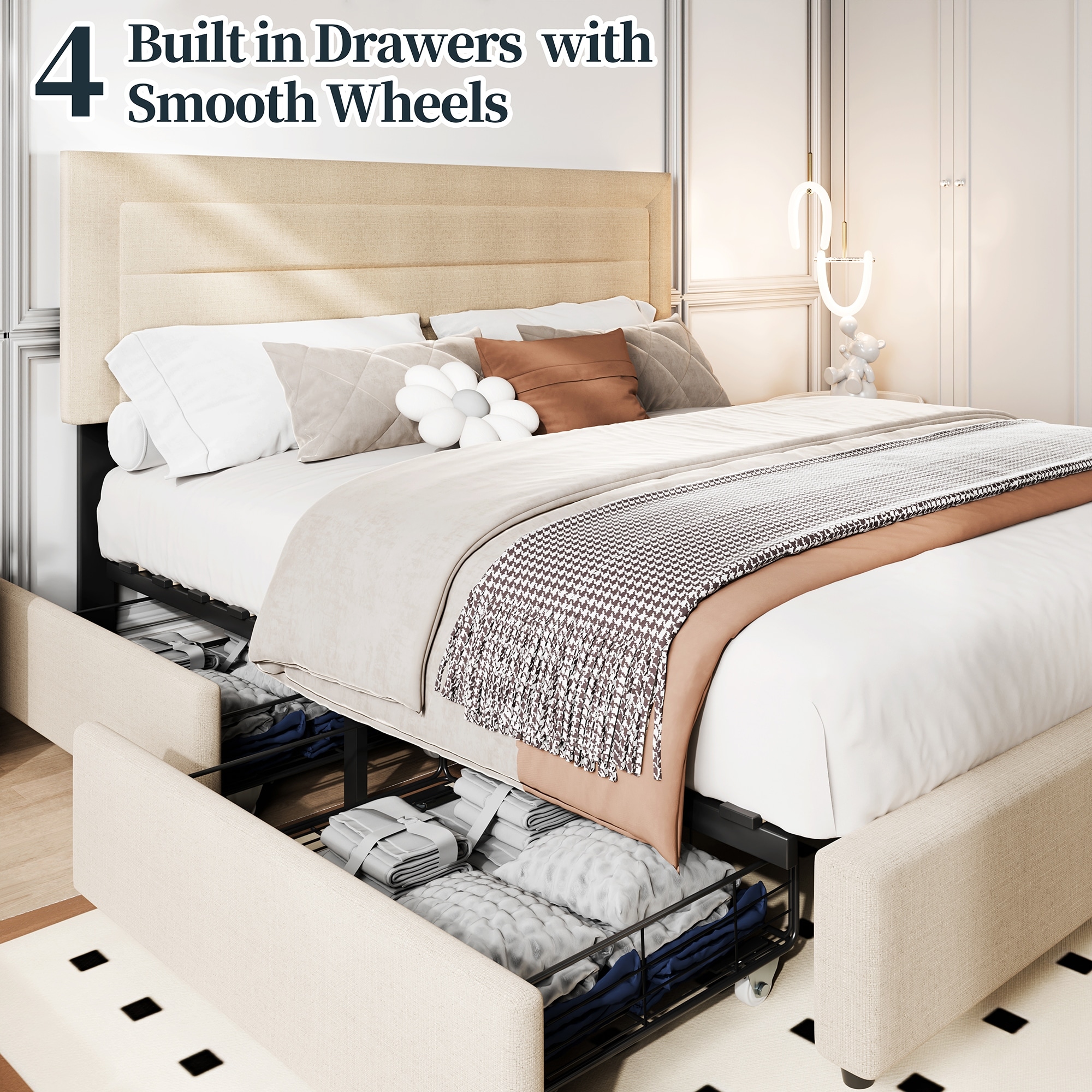 Full & Queen Size Storage Bed Frame with 4 Lockable Drawers, Adjustable Headboard