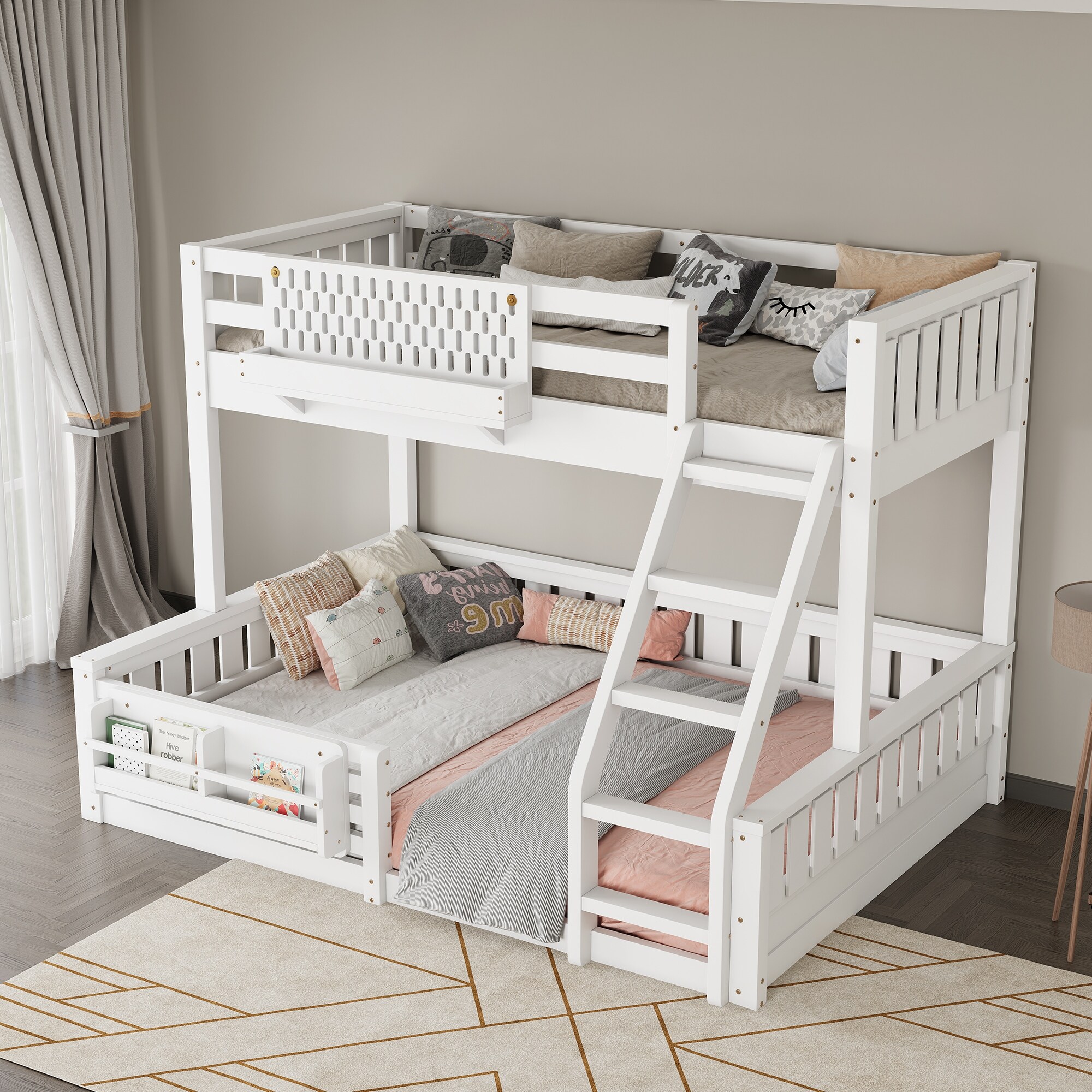 Twin XL Over Queen Bunk Bed With Ladder Guardrails Pegboard Bookshelf Beige Finish