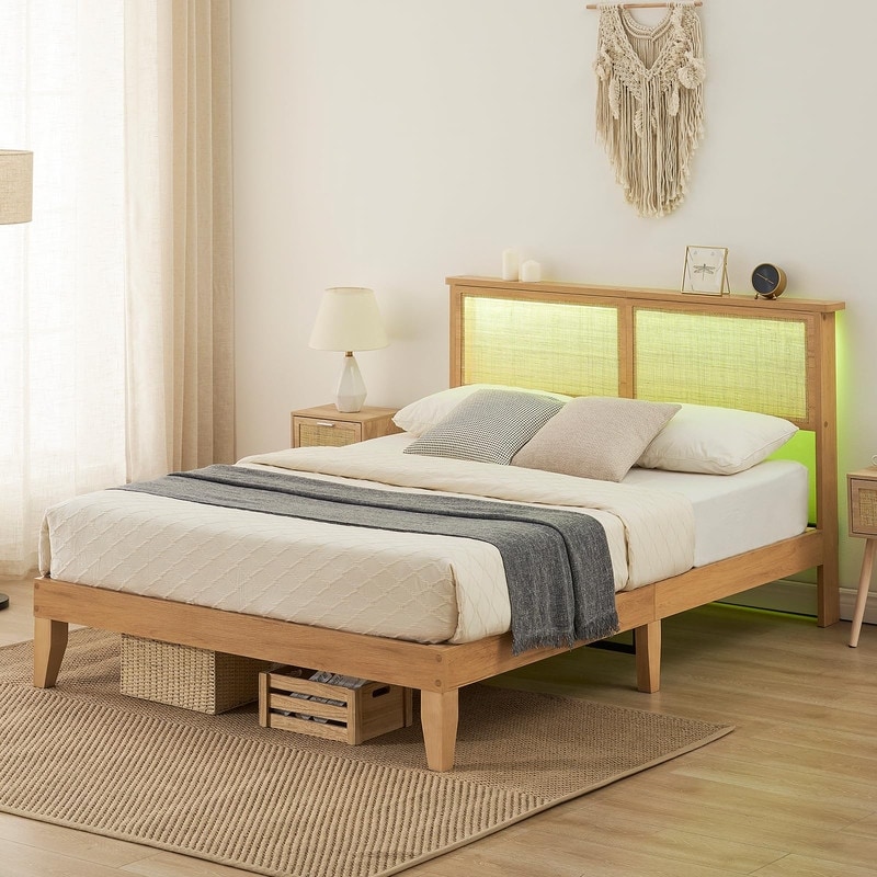 Modern Rattan Bed Frame with Natural Wood Headboard, Bohemian Rattan Wood Bed with LED Lights and Storage Shelf