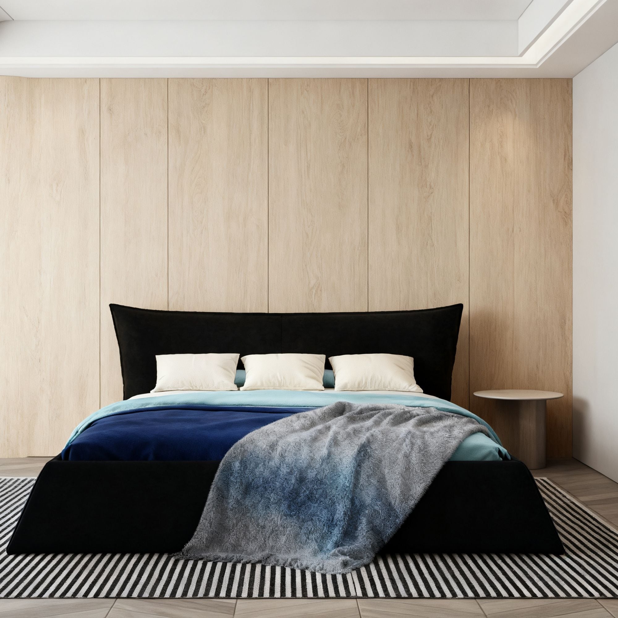 Modern King Bed - Minimalism Design, Bronc Headboard, Solid Wood Frame, Laser Engraved Decor