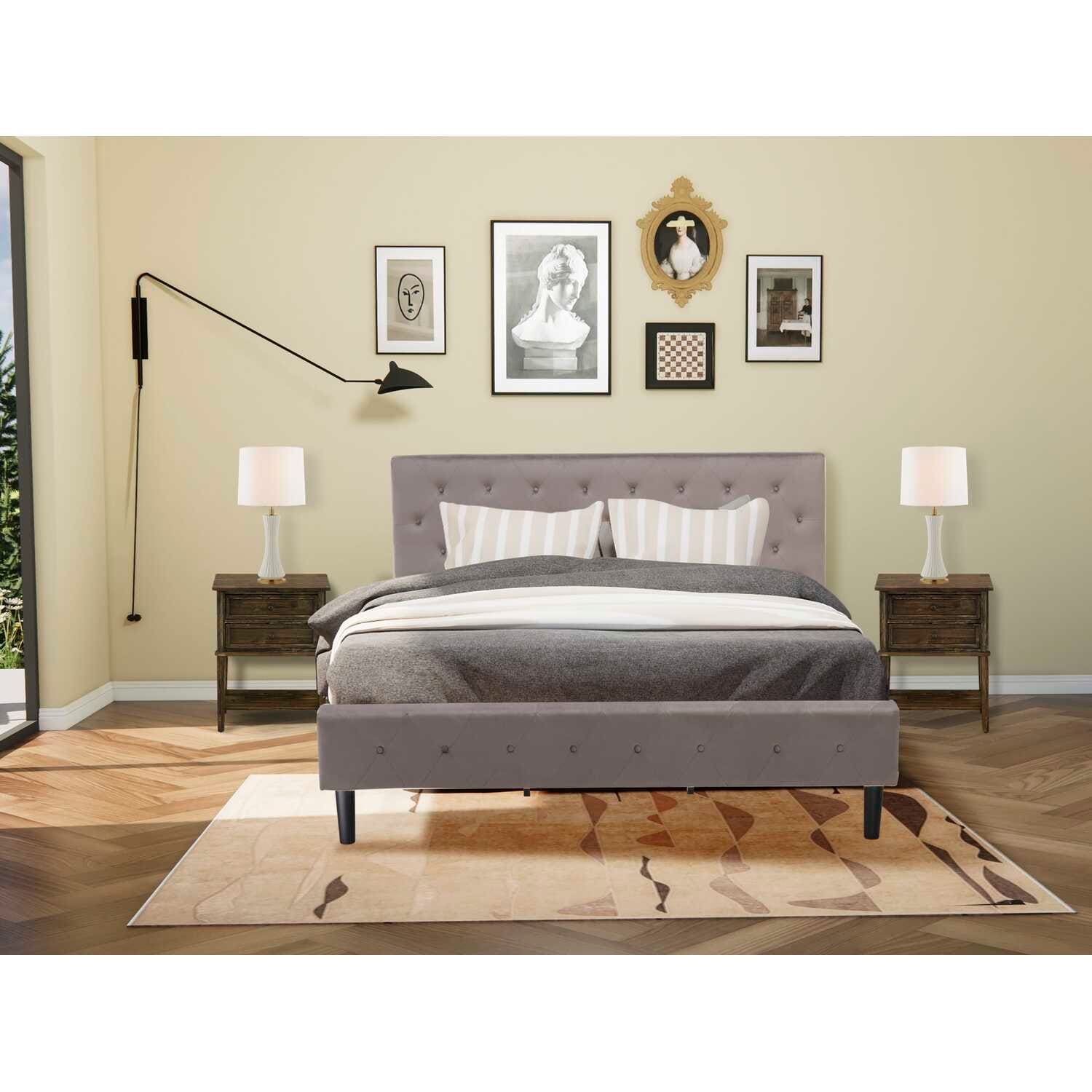 3-Piece Bed Set - Velvet Upholstered Platform Bed with Nightstand