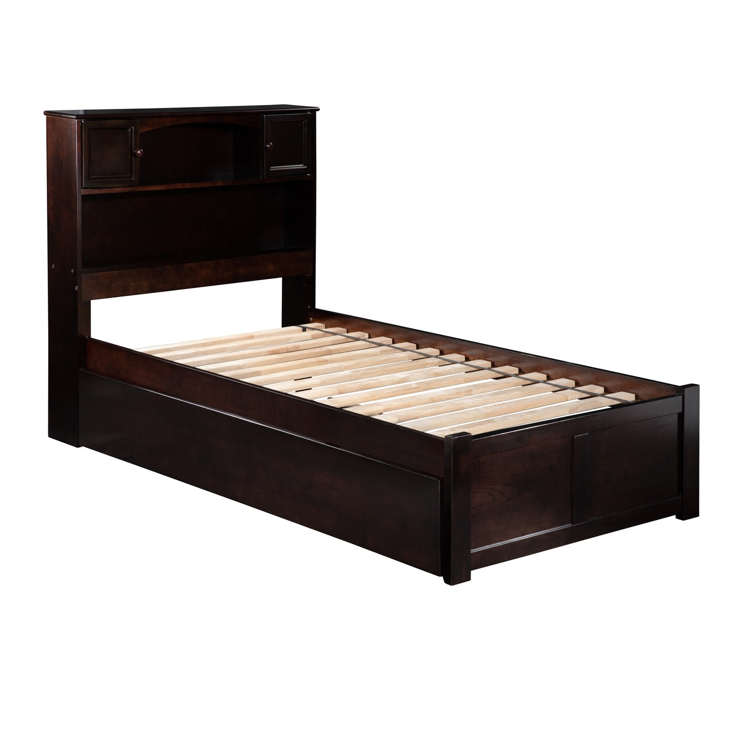 Twin Platform Bed with Trundle & Bookcase Headboard - Espresso Finish, Space Saving Design