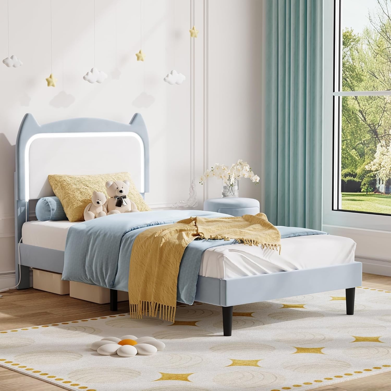 Platform Bed Frame, Noise Free Upholstered Bed Frame with Cat Headboard, GRB LED Lights