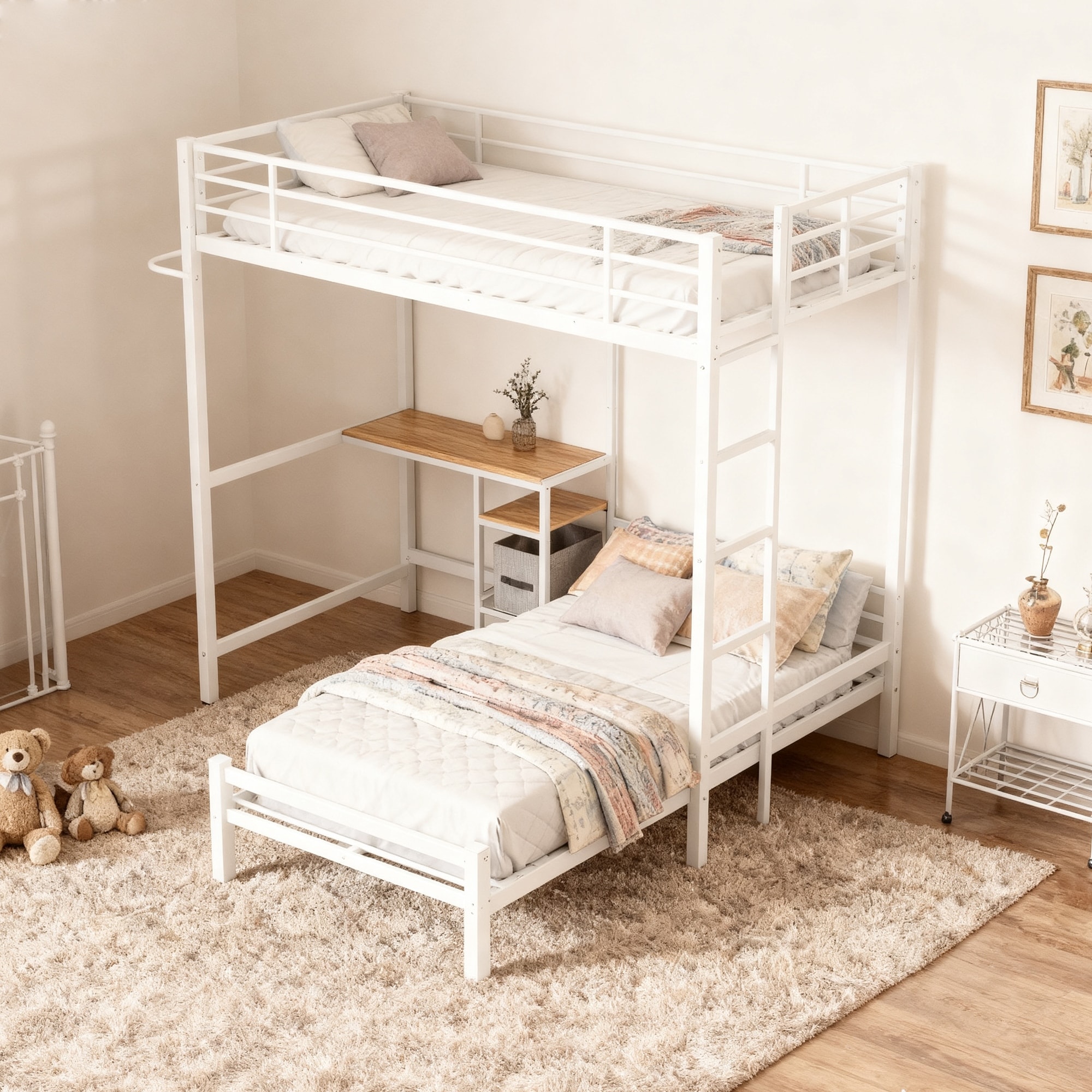Bunk Bed Twin Over Twin Size with Desk Station L-Shaped Metal Bunk Bed Storage Shelves and Drawers Loft Beds