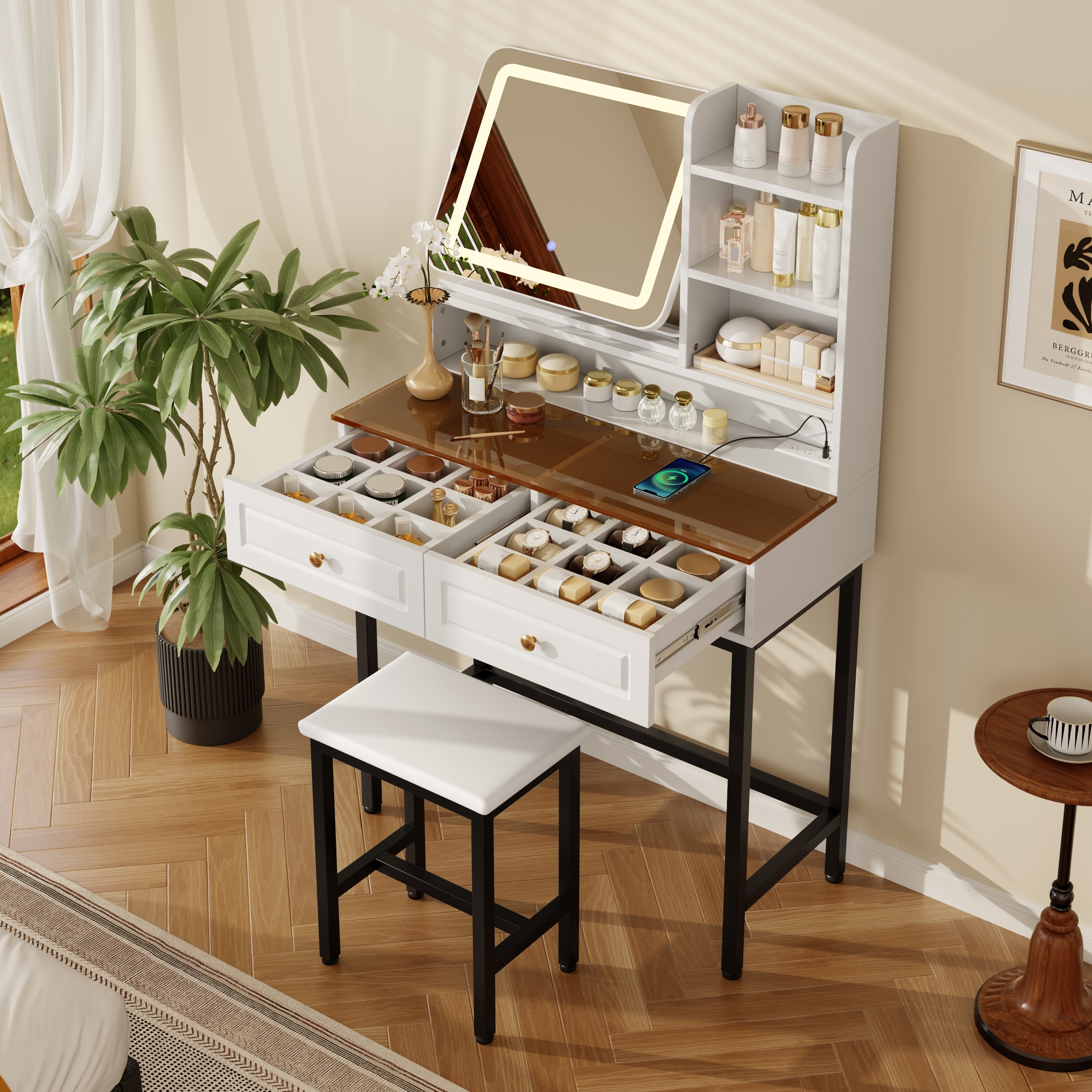 Makeup Vanity with 360 degrees Rotatable LED Mirror,Dressing Table Set with 2 Drawers,Power Outlet and Shelves,Amber Glass Top