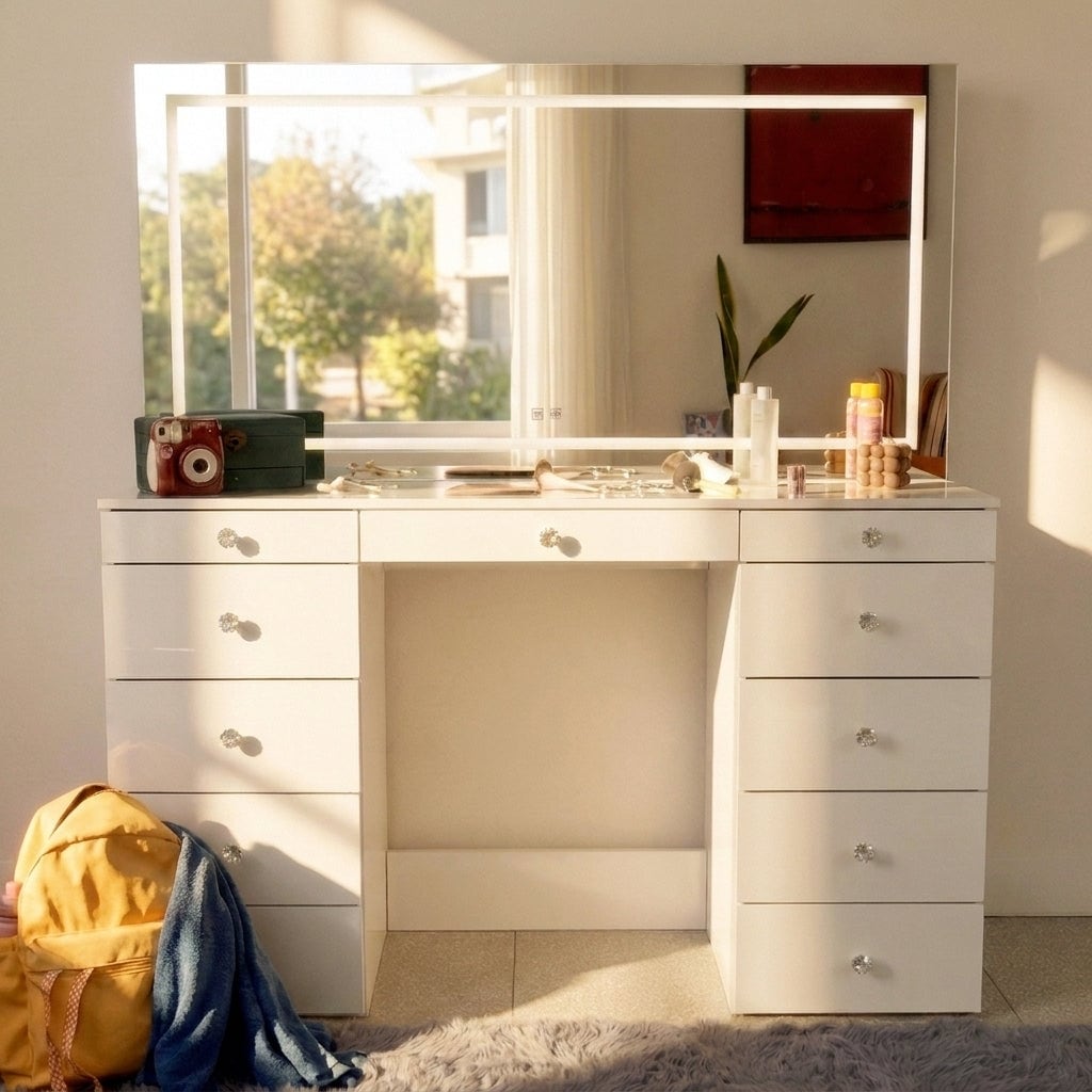 Boahaus Amelia 11 Drawer Makeup Vanity Desk with Mirror and Lights, Storage and Power