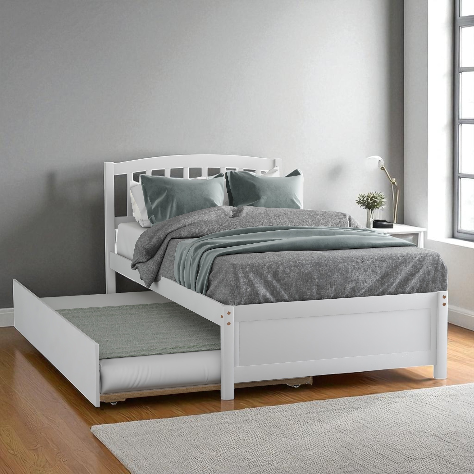 Twin Size Wood Platform Bed Frame with Trundle and Slats, No Box Spring Required, Solid Wood Base