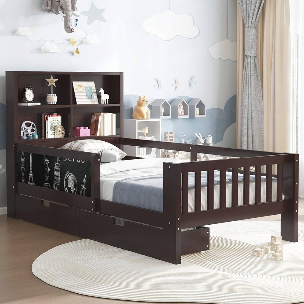 Wooden Platform Bed with Storage Drawers Bookcase Headboard All-in-One Cabinet & Shelf for Bedroom No Box Spring Needed