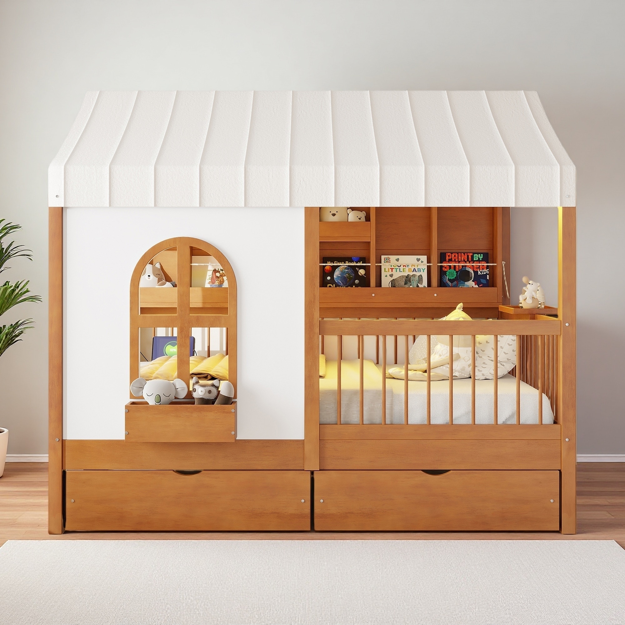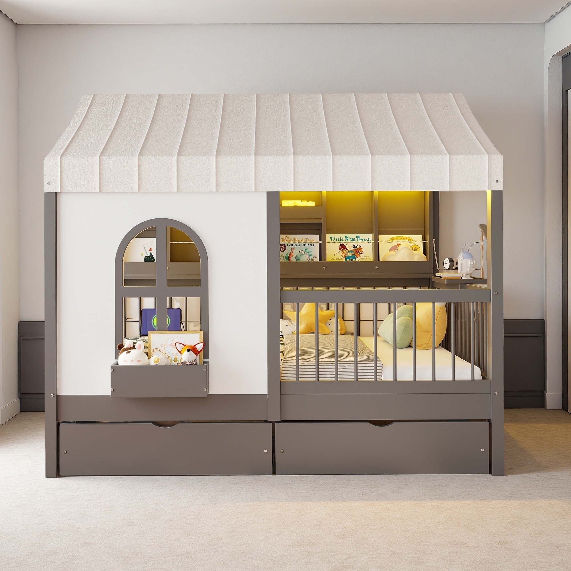 Full Size Pine & MDF House Bed with 2 Large Drawers, Side Bookshelf with LED Strip, Built-In Charging Board for Kids' Room