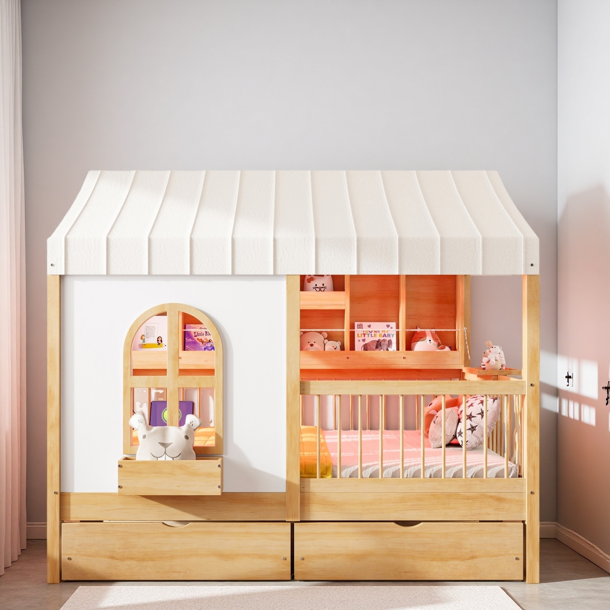 Queen House Bed with Roof Wood Montessori Floor Beds for Kids Wood House Floor Bed Frame for Girls Boys Teens Adults