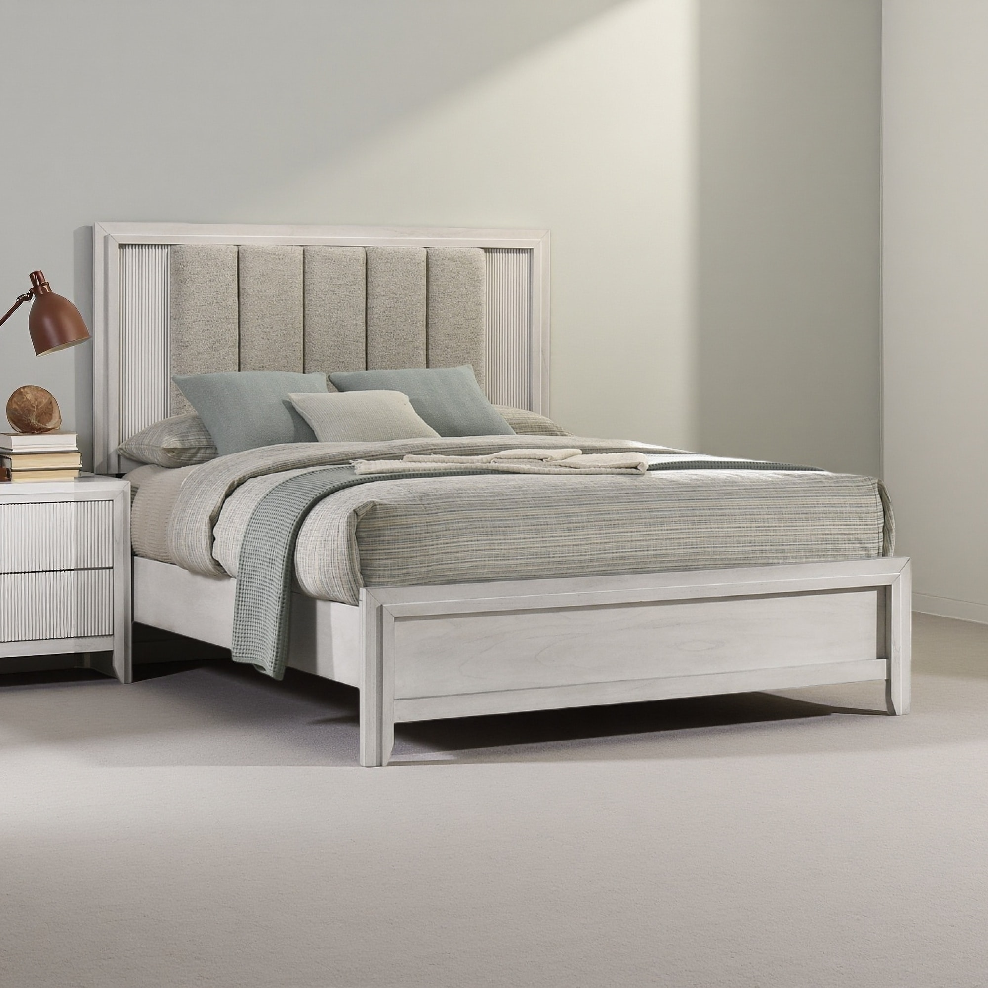 Queen Size Panel Bed with Plush Upholstered Headboard, Sleek Linear & Vertical Channel Details, Framed Wooden Construction