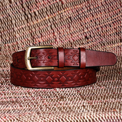 'Artisan-Made Brown Men's Embossed Leather Belt from India'
