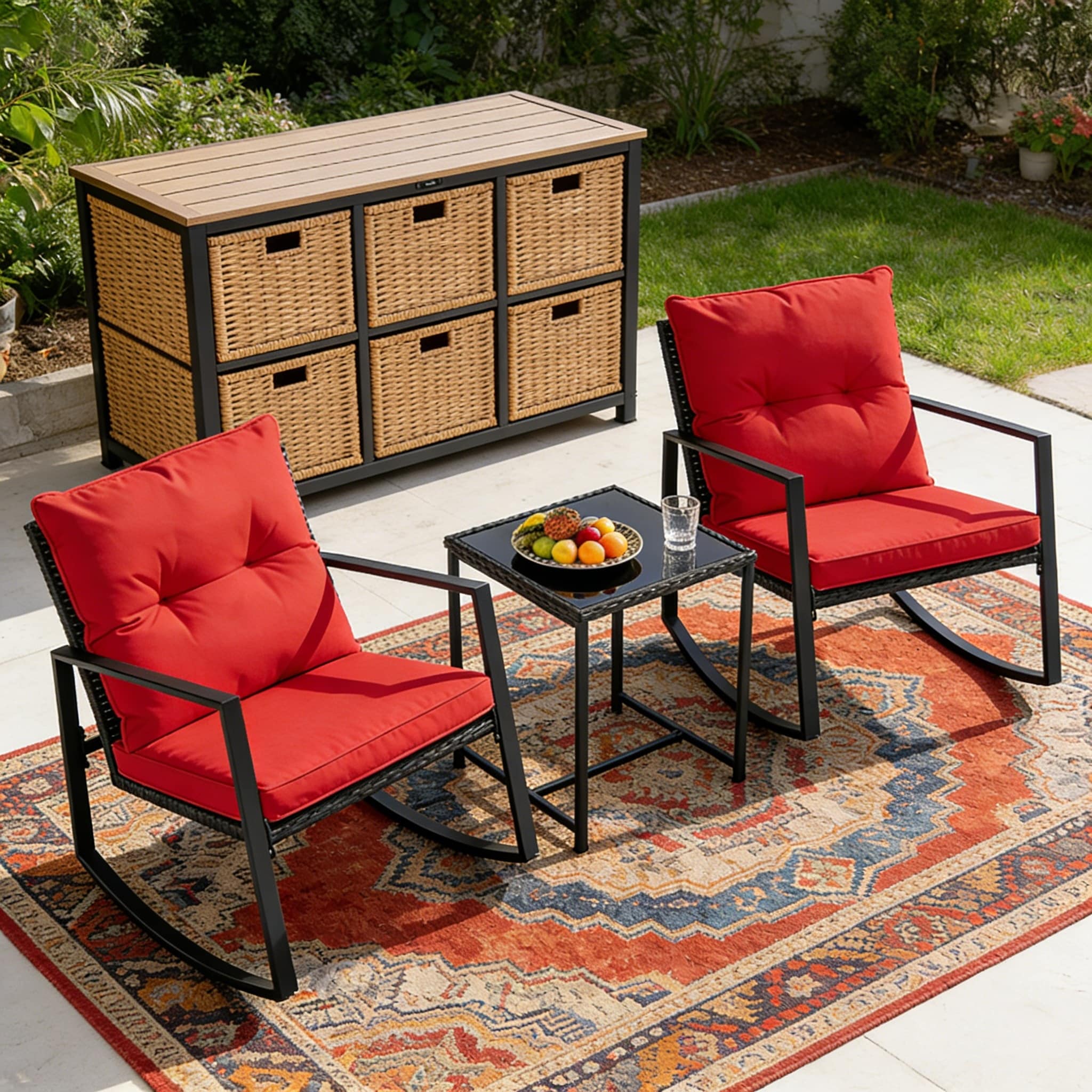 3-Piece Outdoor Patio Black Wicker Metal Rocking Chair Bistro Set with Coffee Table