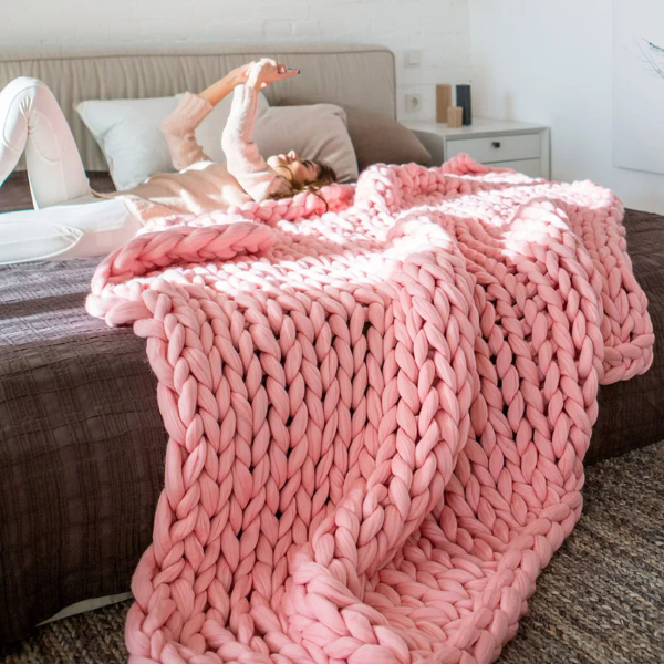 Handmade Chunky Knit Blanket Pink medium 40x47 Inches