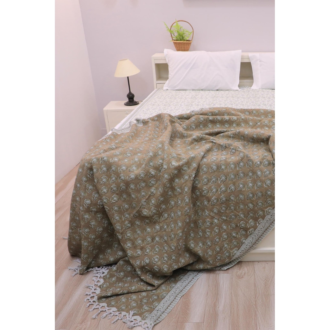 Fabdivine Rohini Handwoven Cotton Throw Blanket - Floral Block Print Decorative Home Accent with Artisan Fringe, 90" x 54"