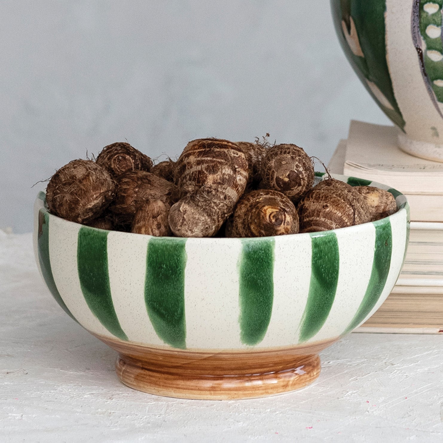 Hand-Painted Stoneware Footed Bowl with Stripes - 10.4"L x 10.4"W x 4.9"H - 10.4"L x 10.4"W x 4.9"H