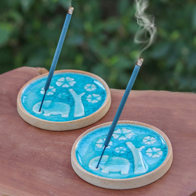 Wise Friend,'Blue Ceramic Elephant Incense Holder with Lotus Flower'