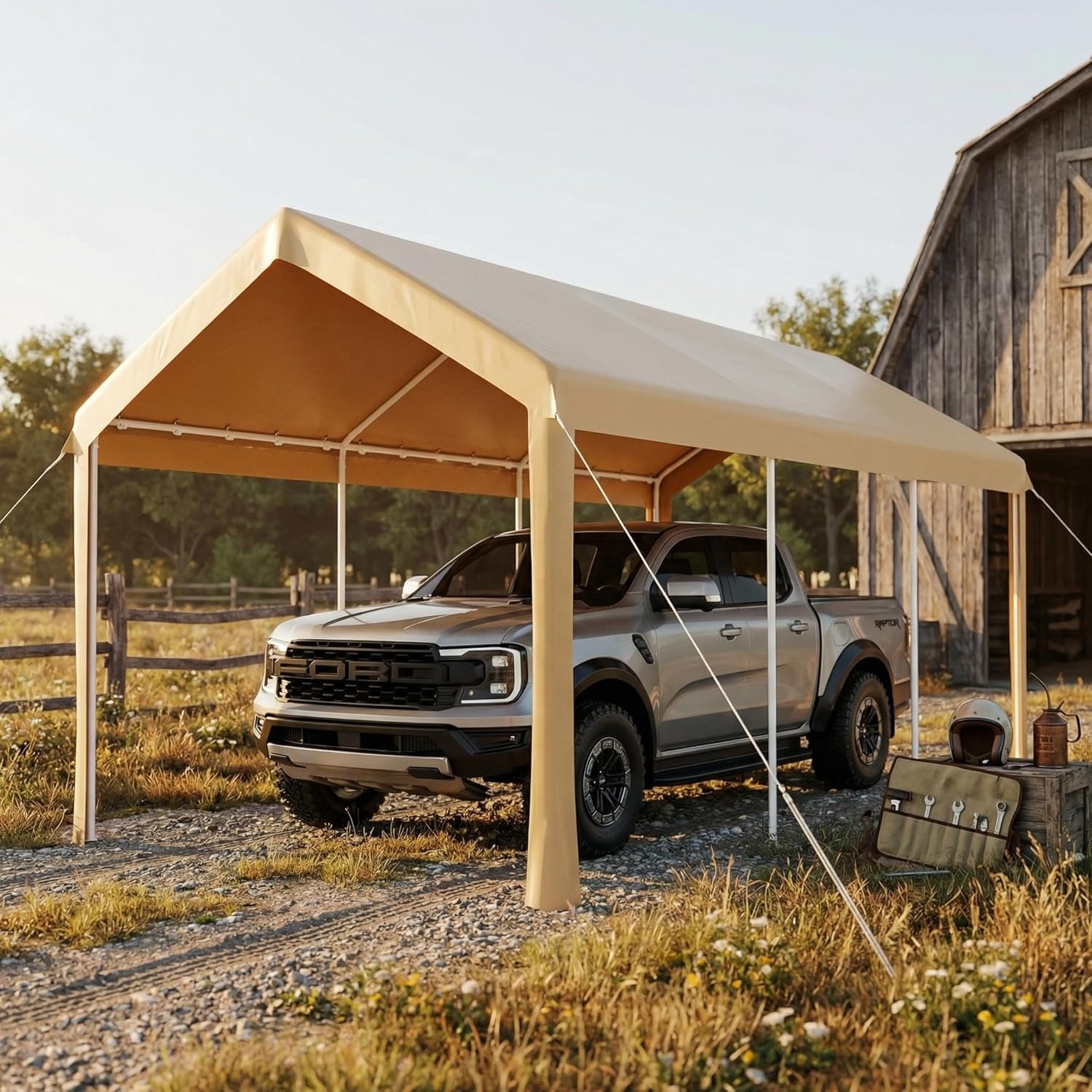 10x15x9FT Metal Carport, Steel Frame Car Shelter with Tarp for Boats Cars Tractors - 10x14.4FT