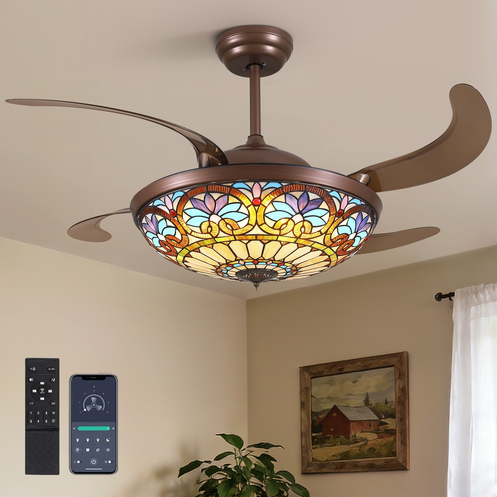 Smart Tiffany Stained Glass Retractable Chandelier Dimmable Ceiling Fan