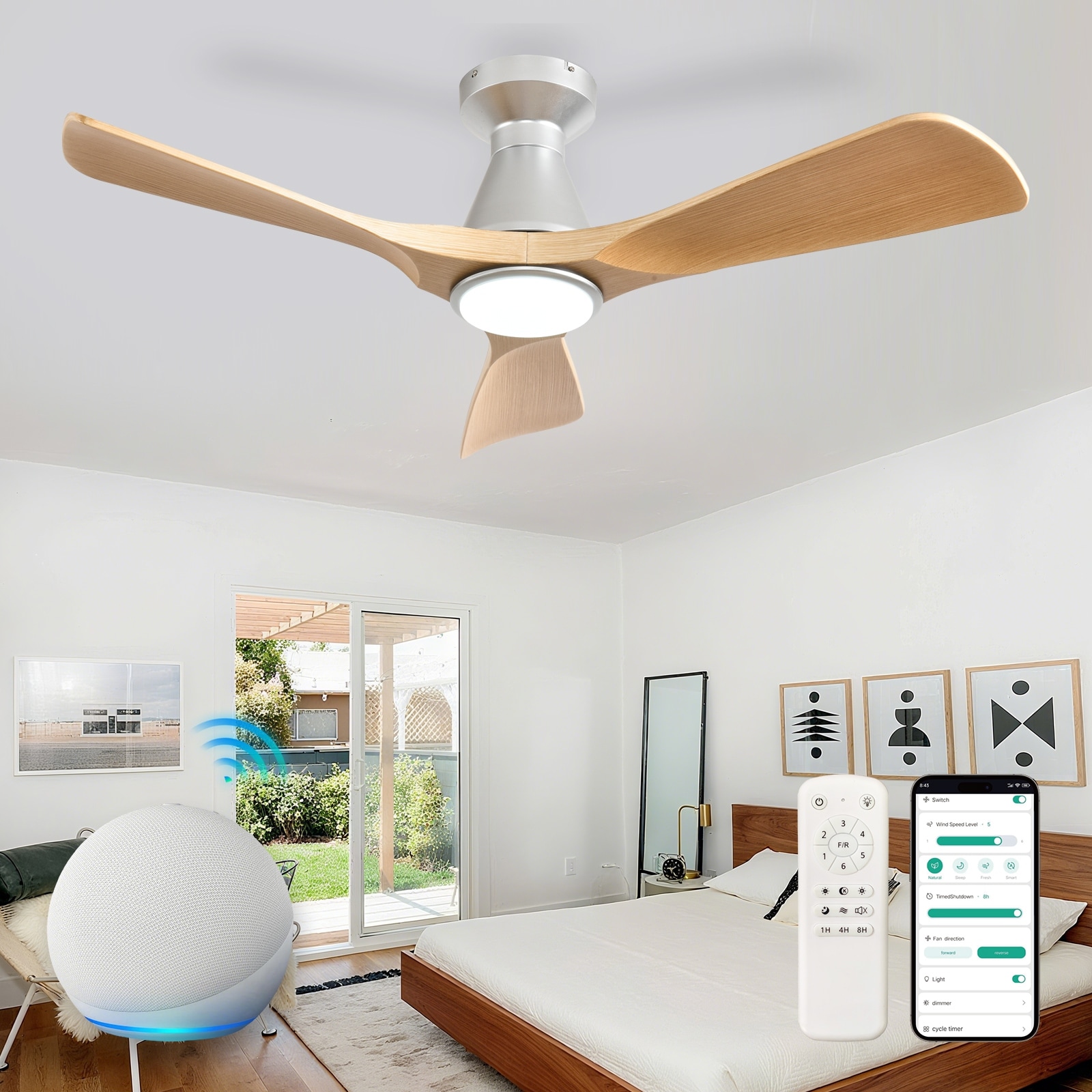 52 Inch Smart Ceiling Fan with Sand Nickel Finish 3 Natural Wood Blades LED 18W Triple Color Dimmable Memory Lighting