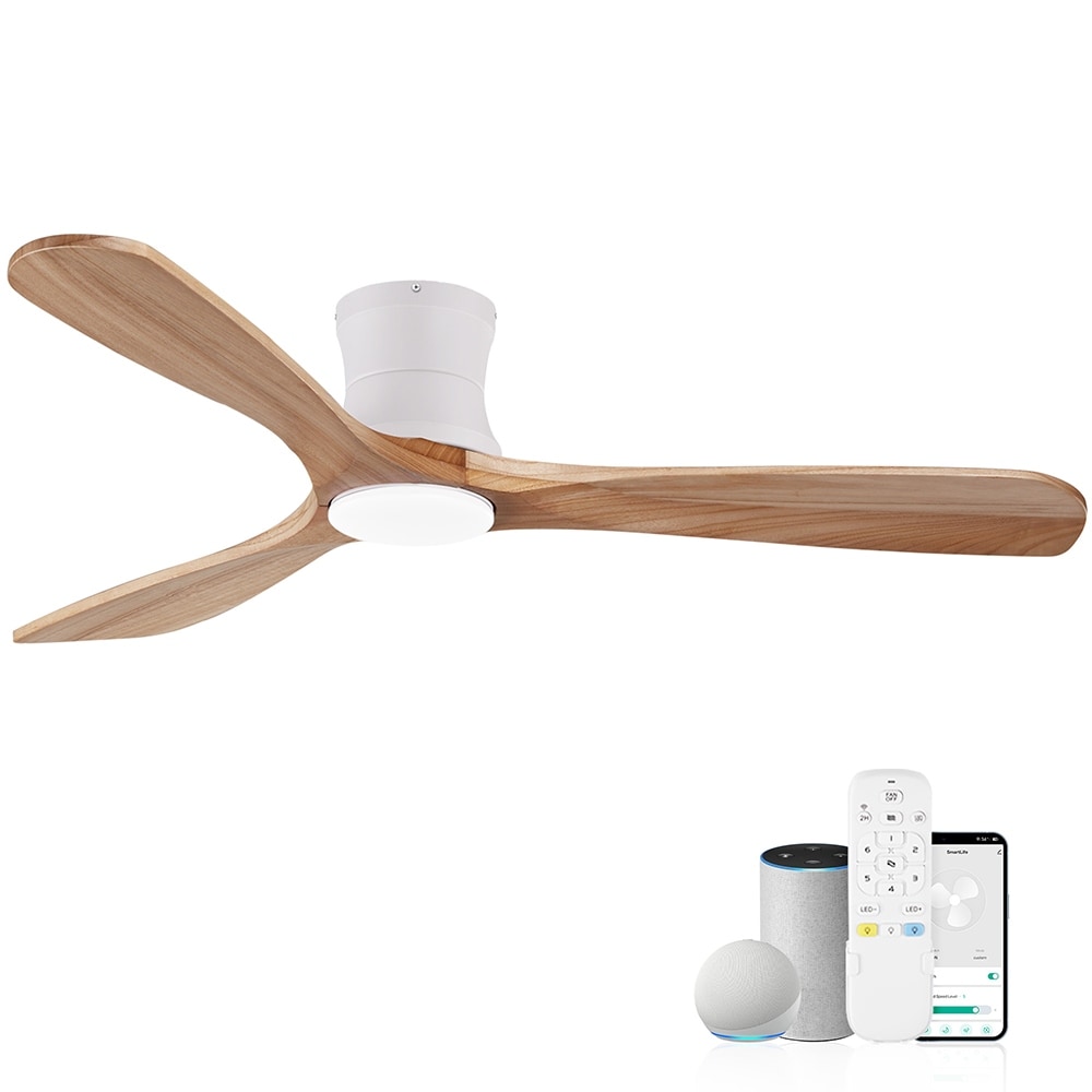 52" Smart Flush Mount Ceiling Fan with Dimmable LED Lights, White Oak