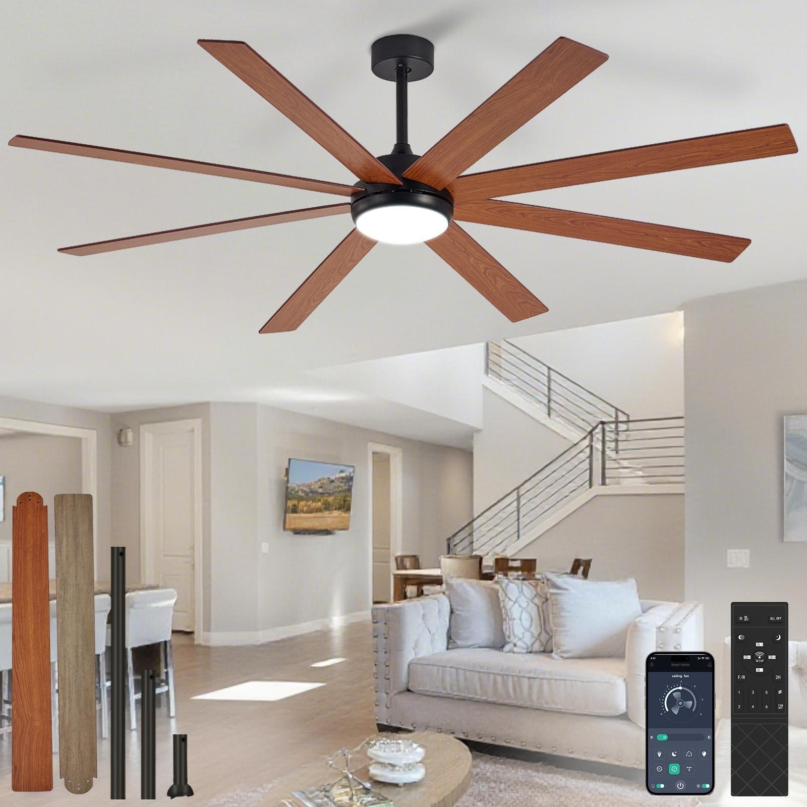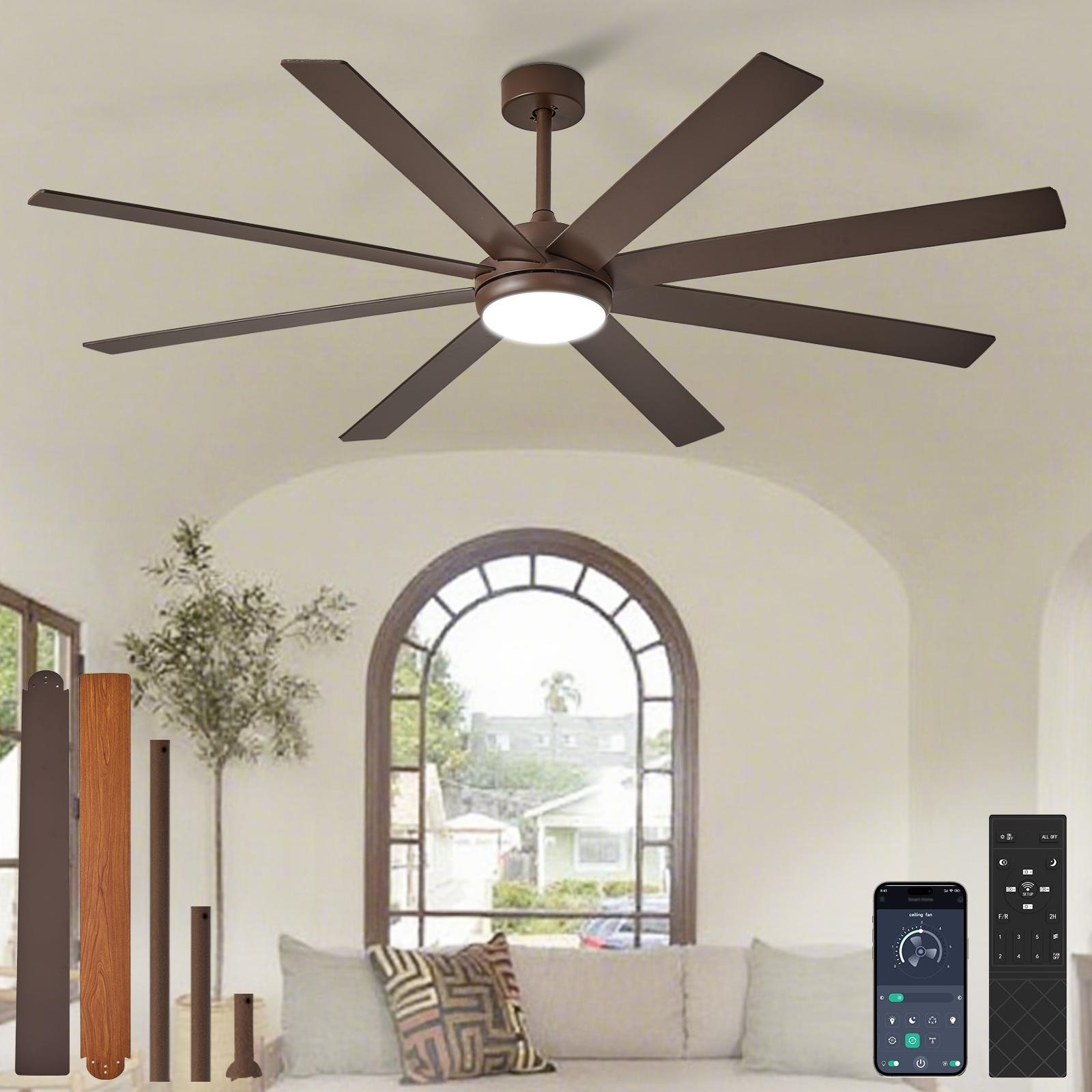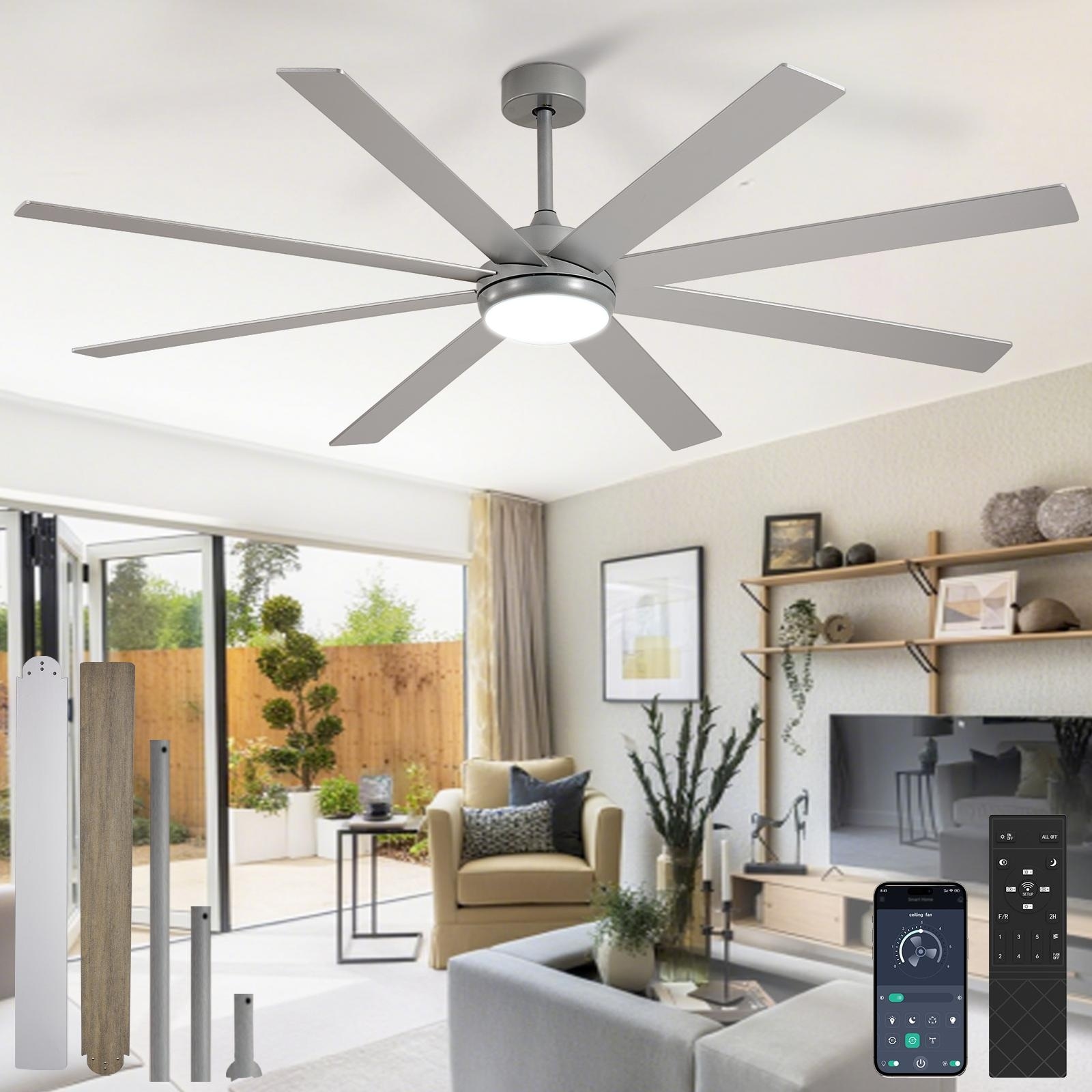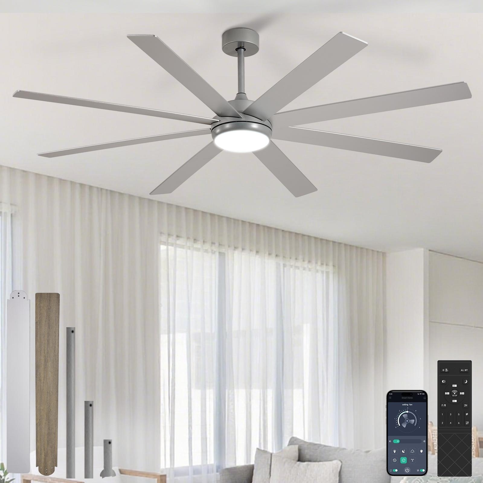 Large Ceiling Fan with Light - 8-Blade, Remote App Control, Dimmable 3CCT, Quiet DC Motor, 66/72 Inches
