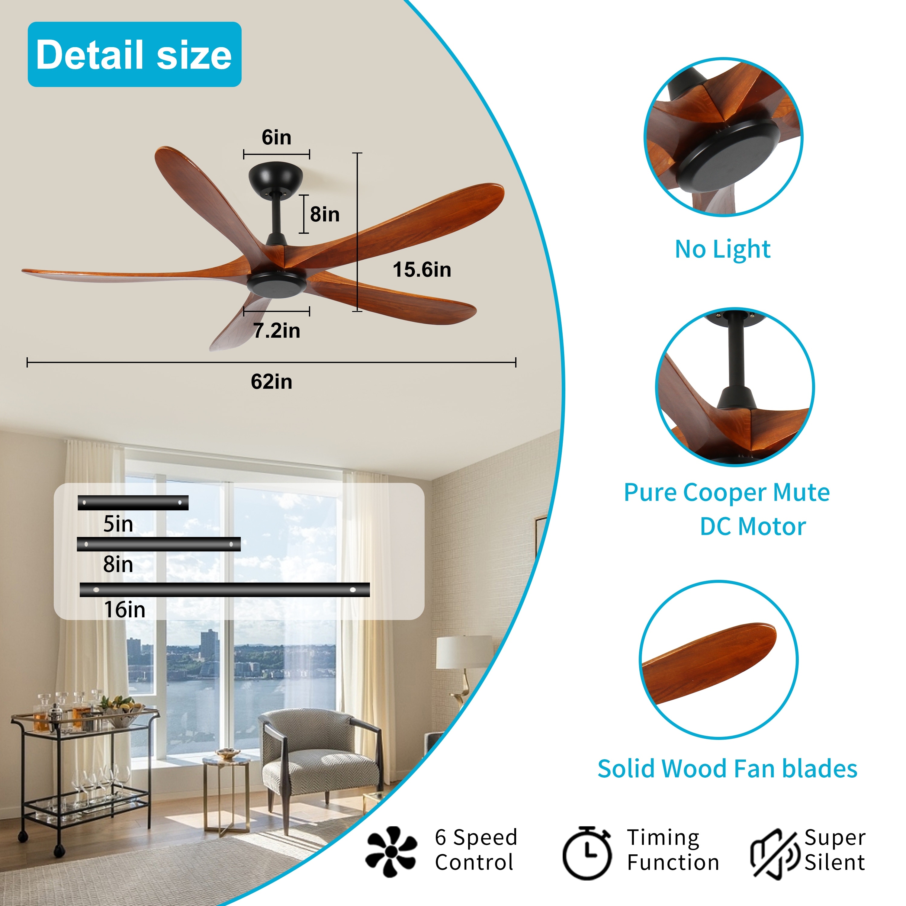 62 Inch Wood Ceiling Fan No Light With Remote Control, Low Profile Ceiling Fan No Light,Noiseless Reversible Dc Motor With Timer