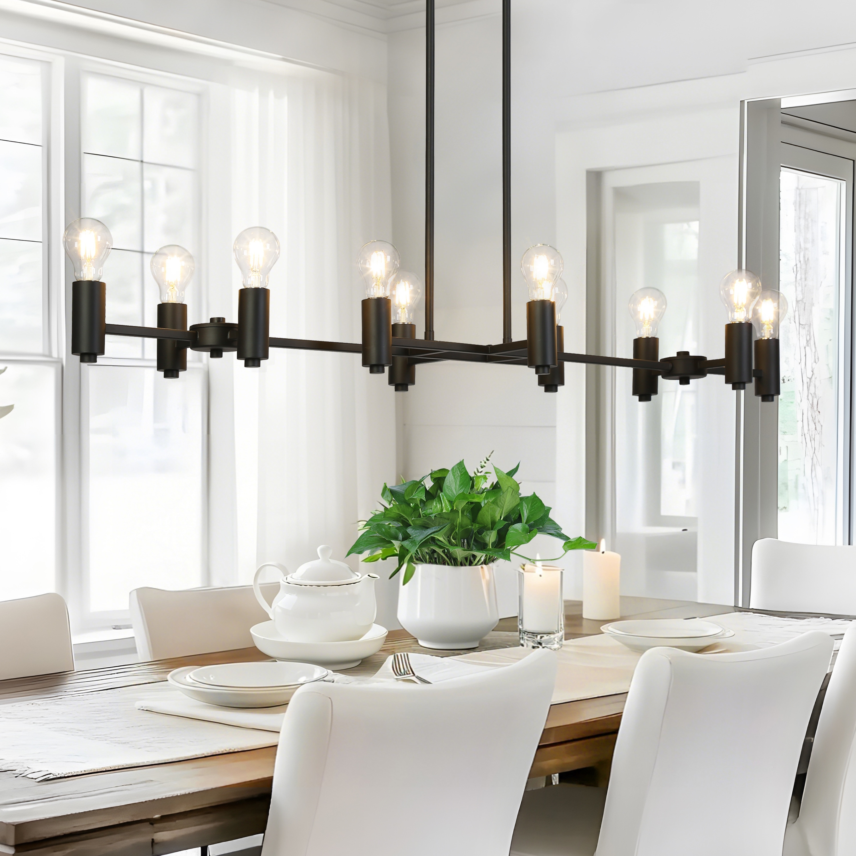 Regan Oversized Modern Farmhouse Black 10-Light Exposed Bulb Linear Dining Room Chandelier - 49.2"W x 13.3"D x 17.9" - 67.9"H