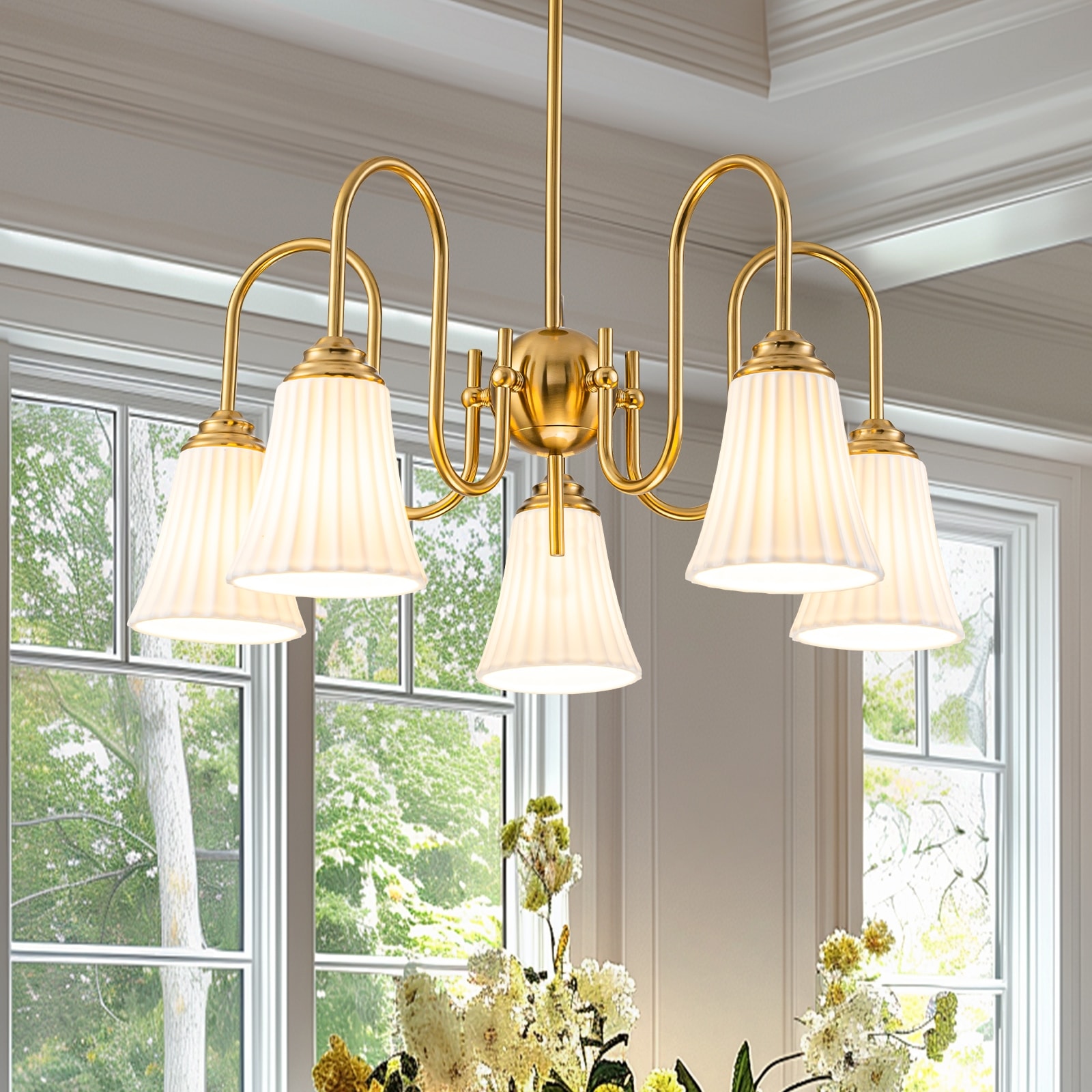 Modern Gold Chandelier Pleated Trumpet White Ceramic Shades