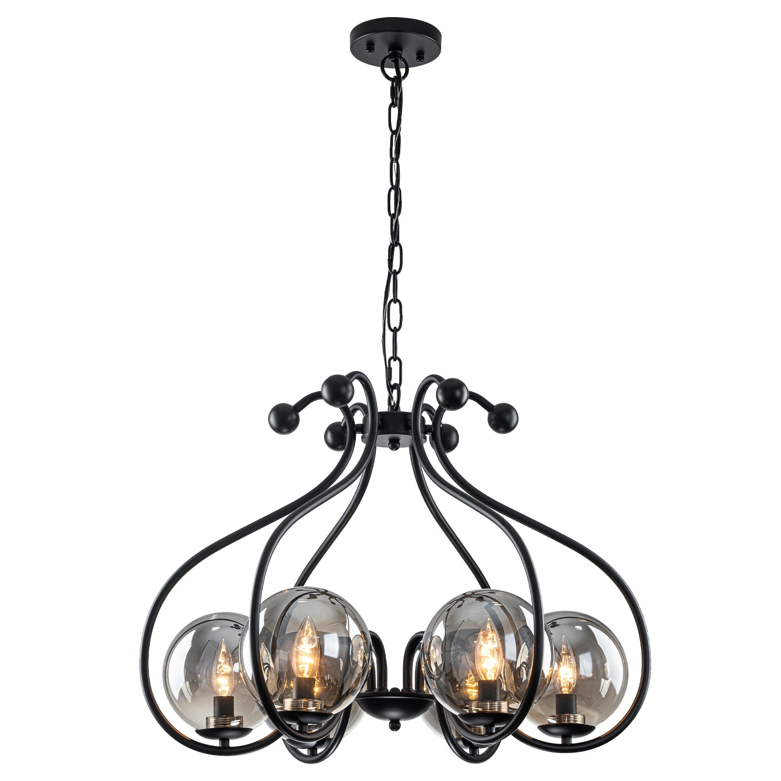 6-Light Matte Black S-Curve Chandelier with Smoky Gray Glass Globes - Dia.24.8-in
