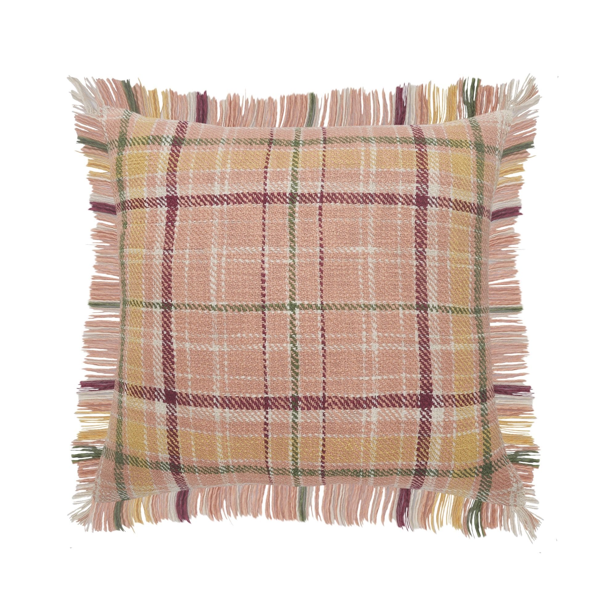20" Pink and Green Plaid Square Throw Pillow with Fringes