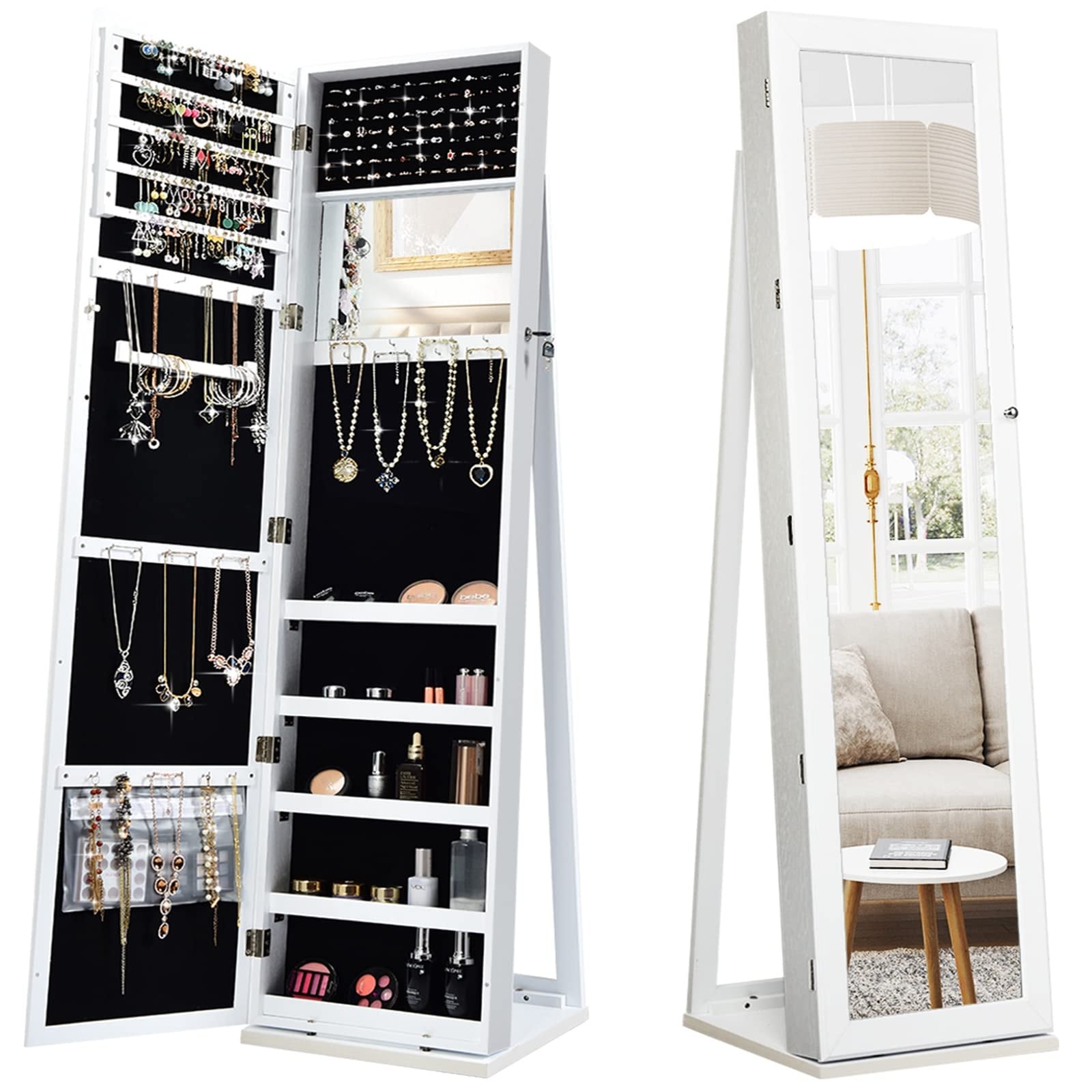 Jewelry Armoire with Full Length Mirror, Lockable Standing Jewelry Cabinet Organizer with Makeup Mirror, Stable Base