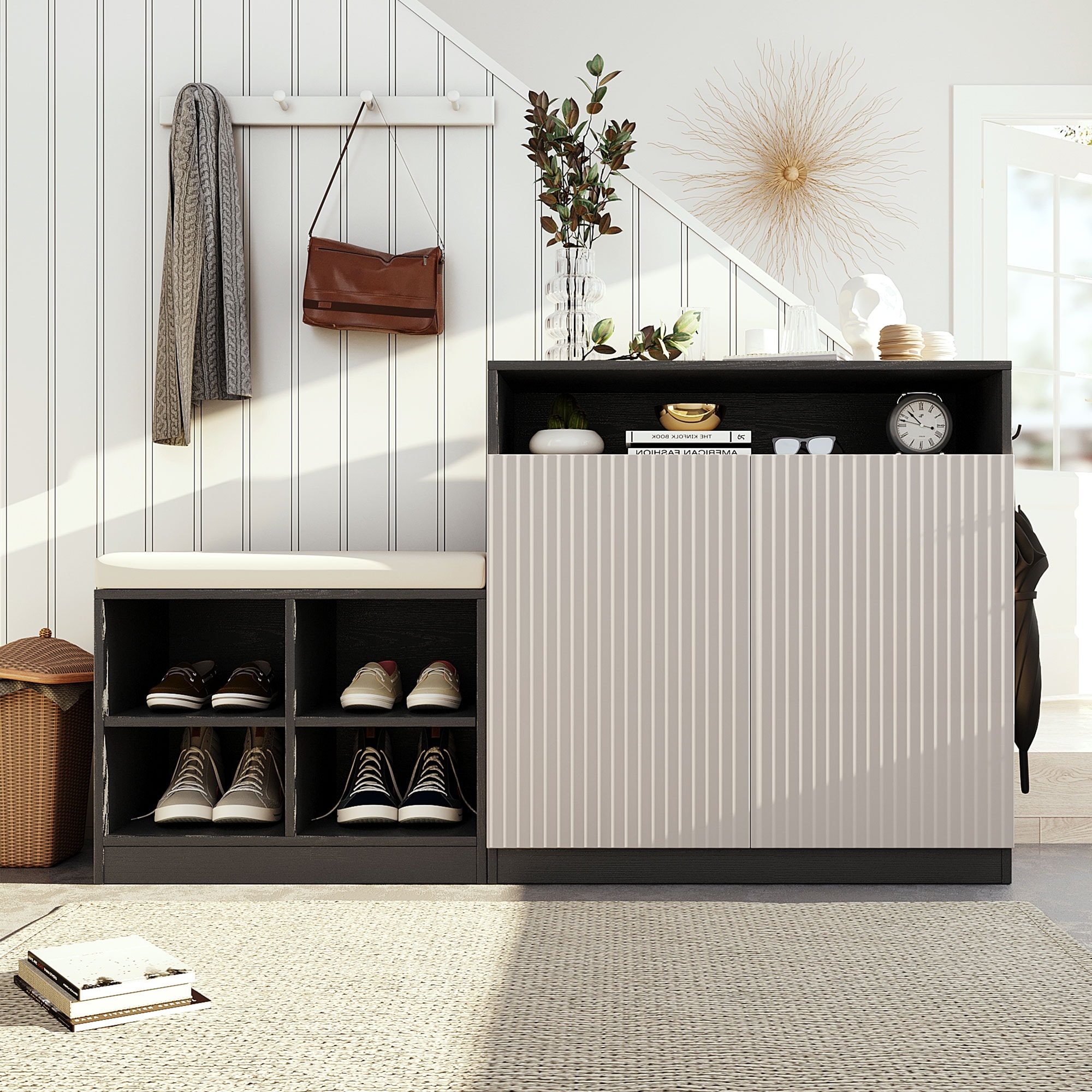 Living Room Cabinet with Shoe Bench - 2 Doors, 3-Tier Adjustable Shelves, 4 Open Racks, Removable Cushion, Hooks