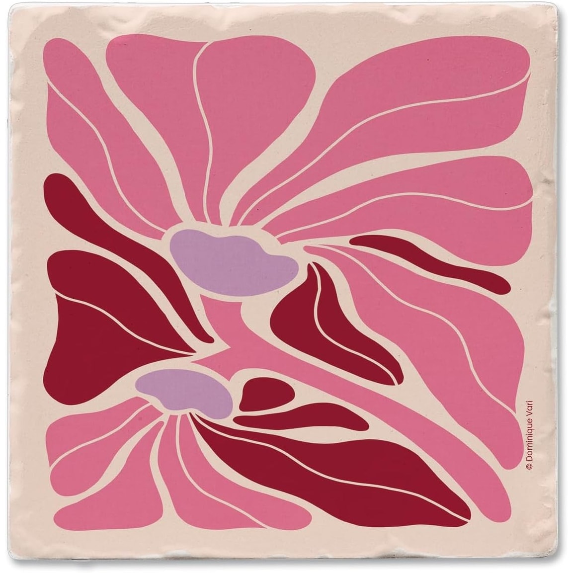 Pink Floral 4 Pack Tumbled Tile Stone Coaster with Protective Cork Backing Made in The USA 4" Square, Colorful, Wipes Clean