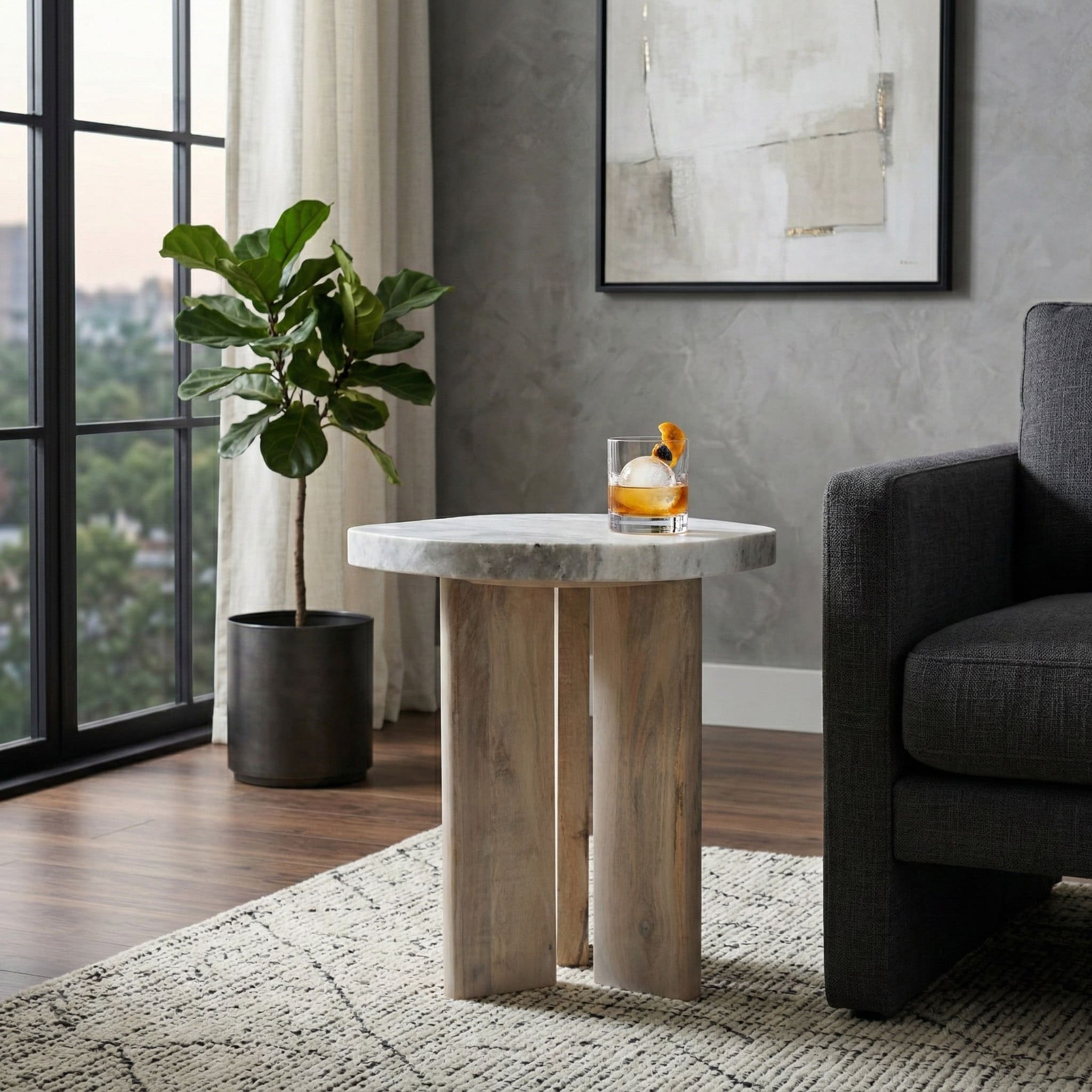 Modern Marble Top Accent Side Table with Wood Base - 23", Tan & Brown - 22.25"